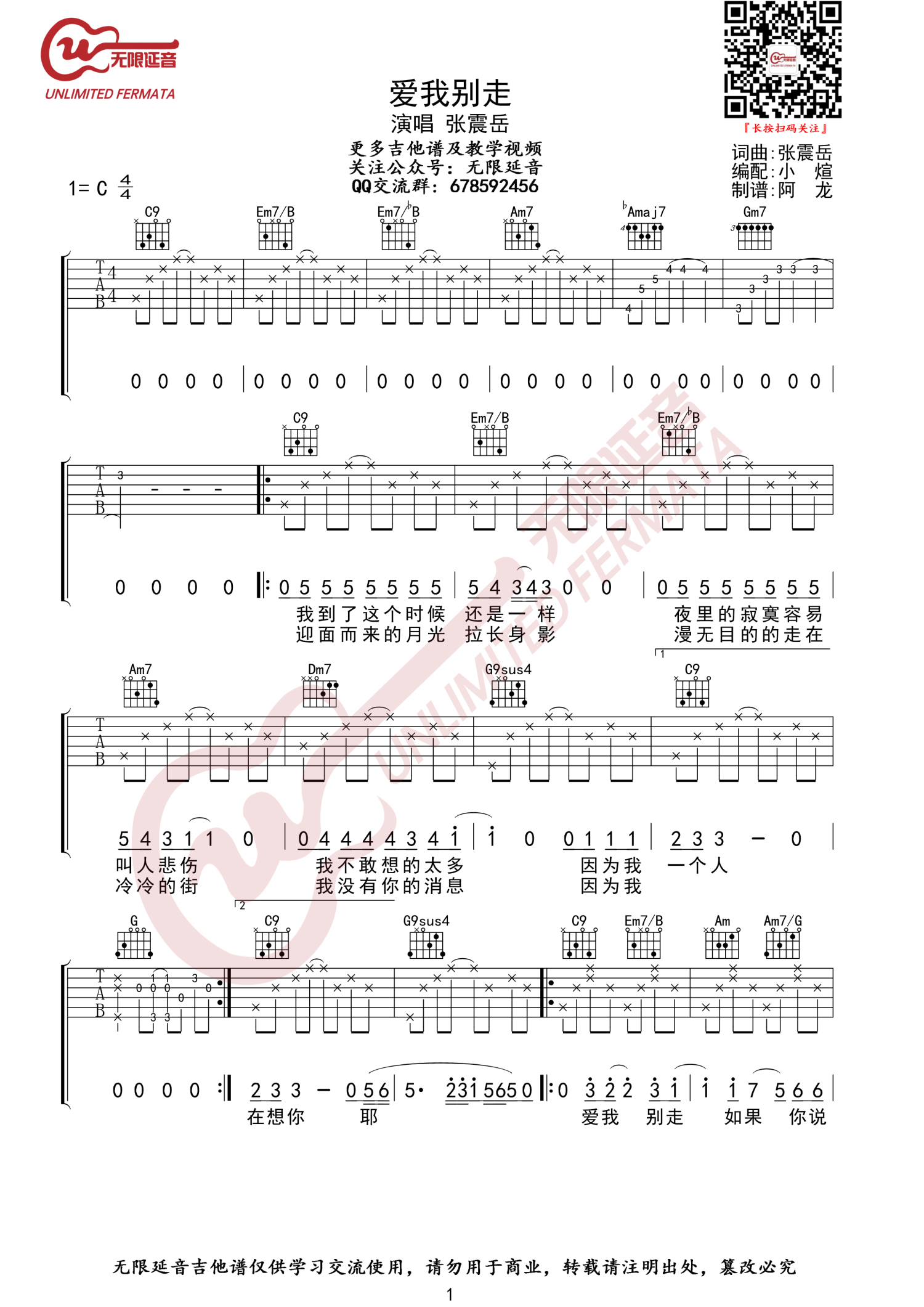 爱我别走吉他谱 - 张震岳 - C调吉他弹唱谱