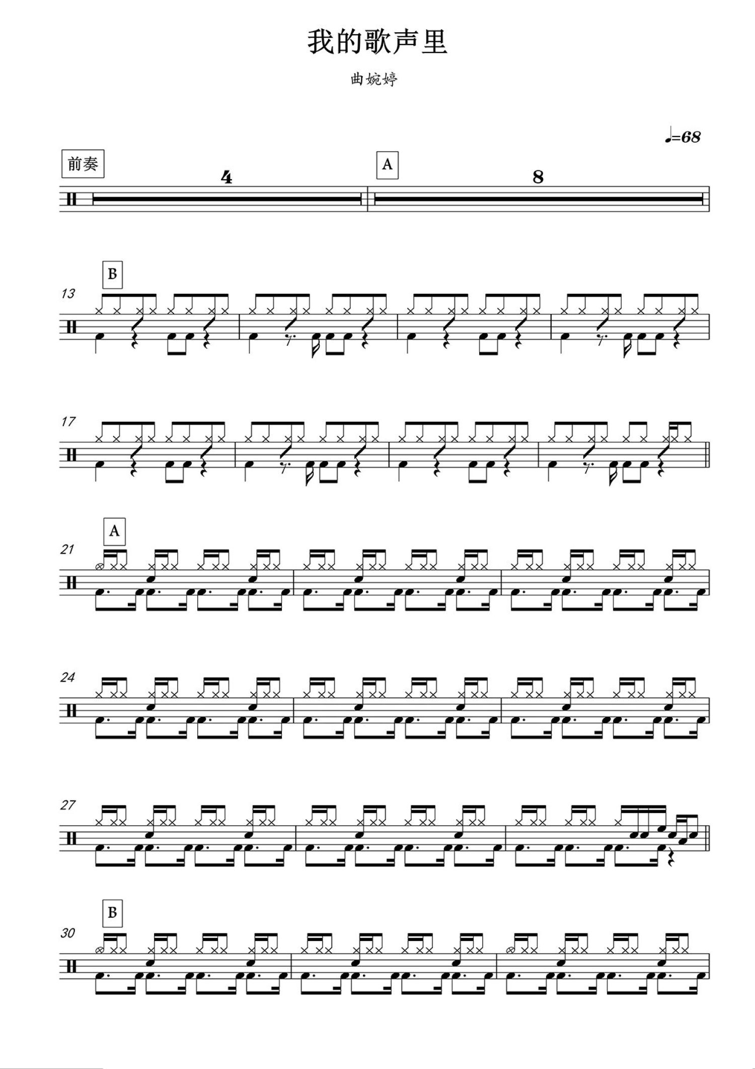 我的歌声里鼓谱 - 曲婉婷 - 架子鼓谱