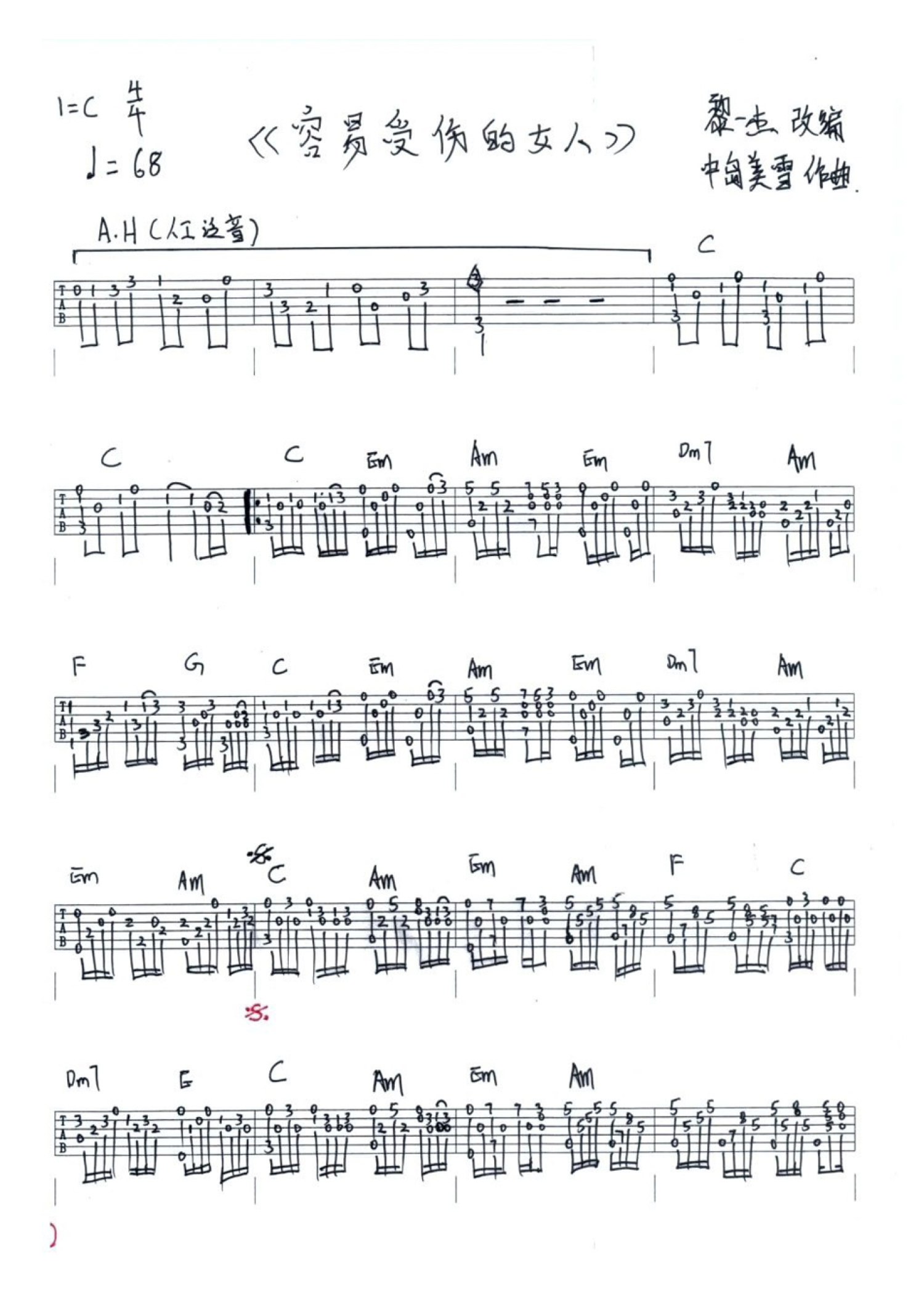 曲谱介绍: 容易受伤的女人吉他独奏曲指弹谱,C调指法编配,中岛美雪作曲,王菲王靖雯时期的经典代表歌曲,容易受伤的女人吉他谱独奏版,由指弹达人黎一杰原创改编的。旋律哀怨动人歌曲到今天听起来依然动人心弦。随手写版图片谱附上这首《容易受伤的女人》吉他独奏示范,琴友们可以参照练习。