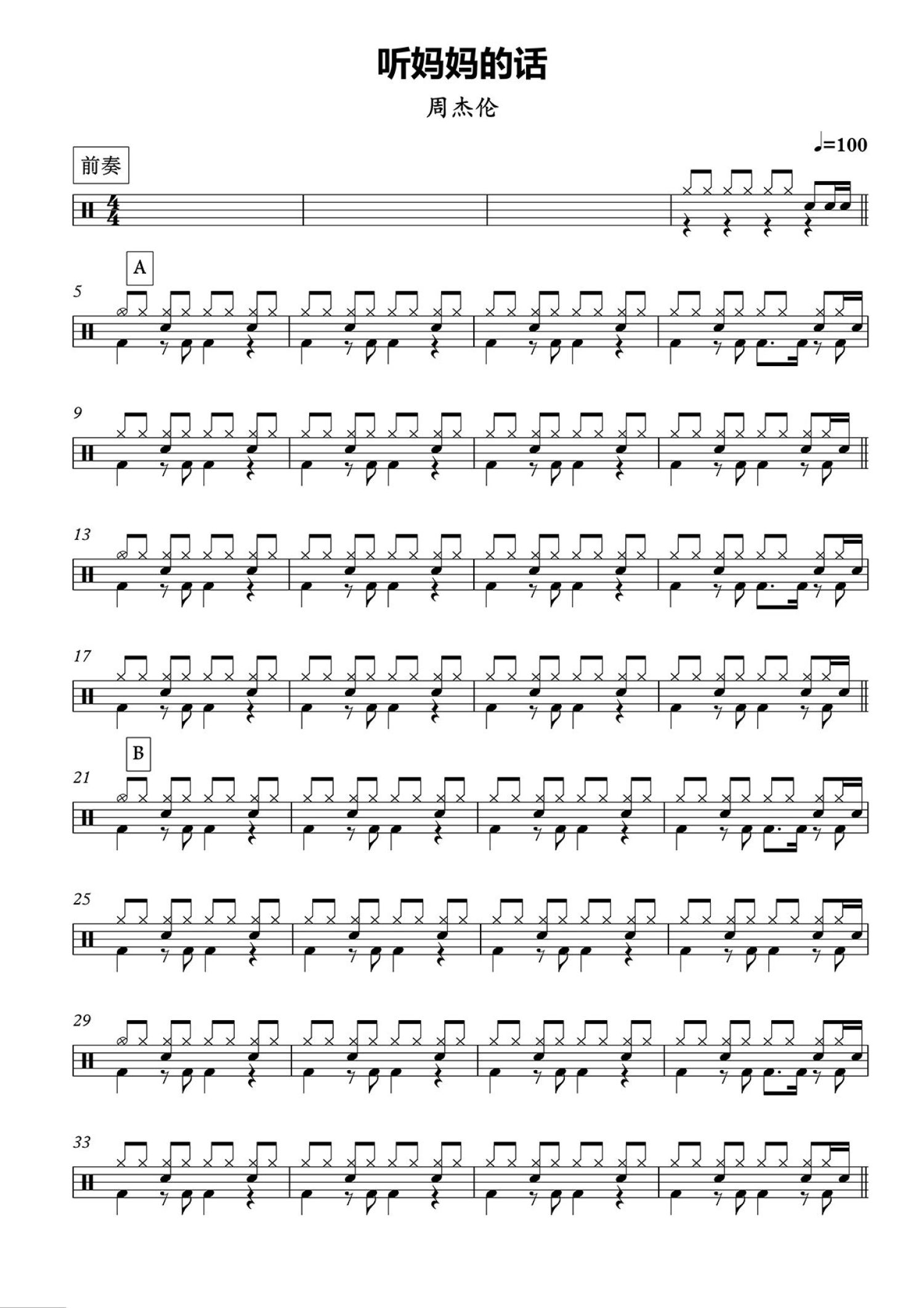 听妈妈的话鼓谱 - 周杰伦 - 架子鼓谱