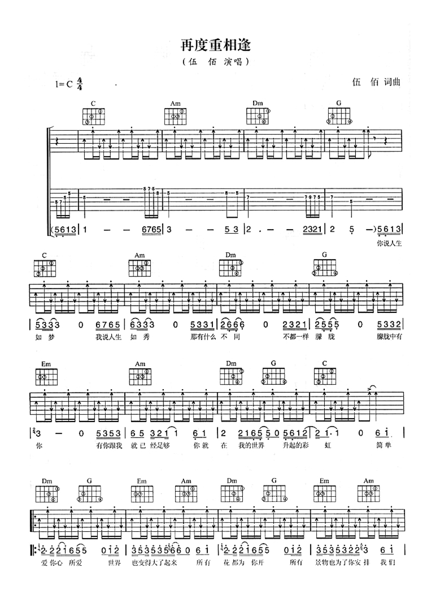 再度重相逢吉他谱 - 伍佰 - C调吉他弹唱谱 - 扫弦版