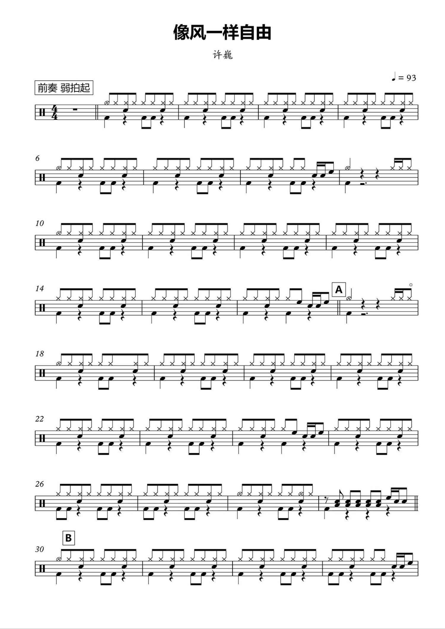• 像风一样自由鼓谱 - 许巍 - 架子鼓谱第1张