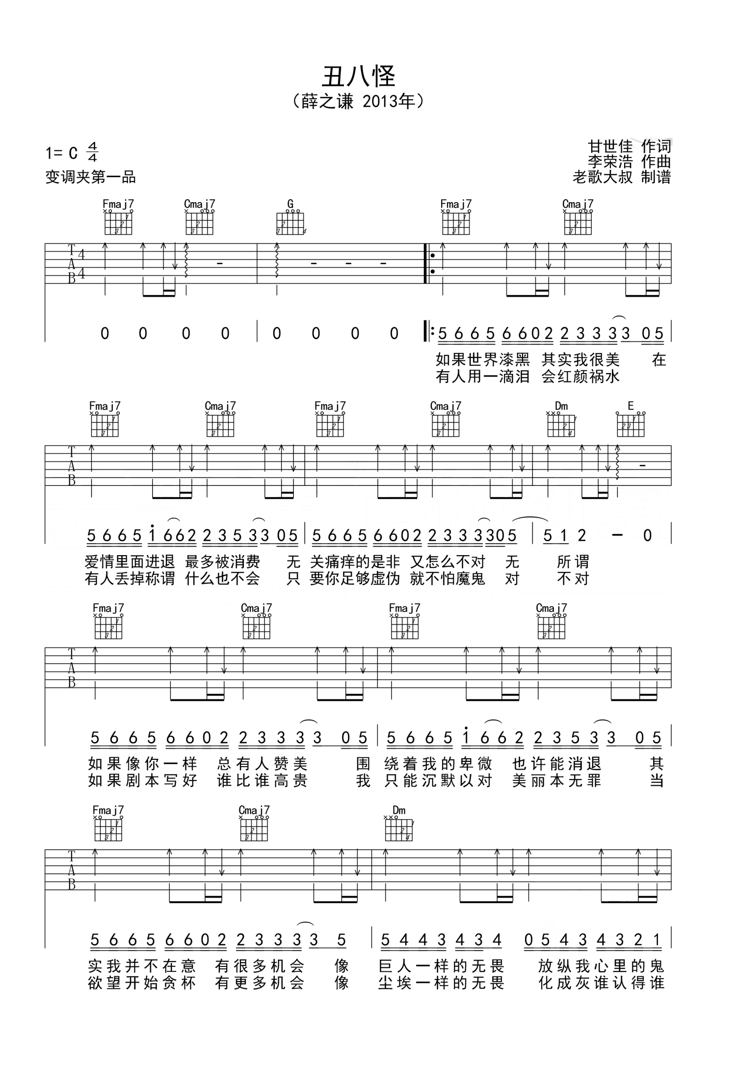 丑八怪吉他谱 - 薛之谦 - C调吉他弹唱谱