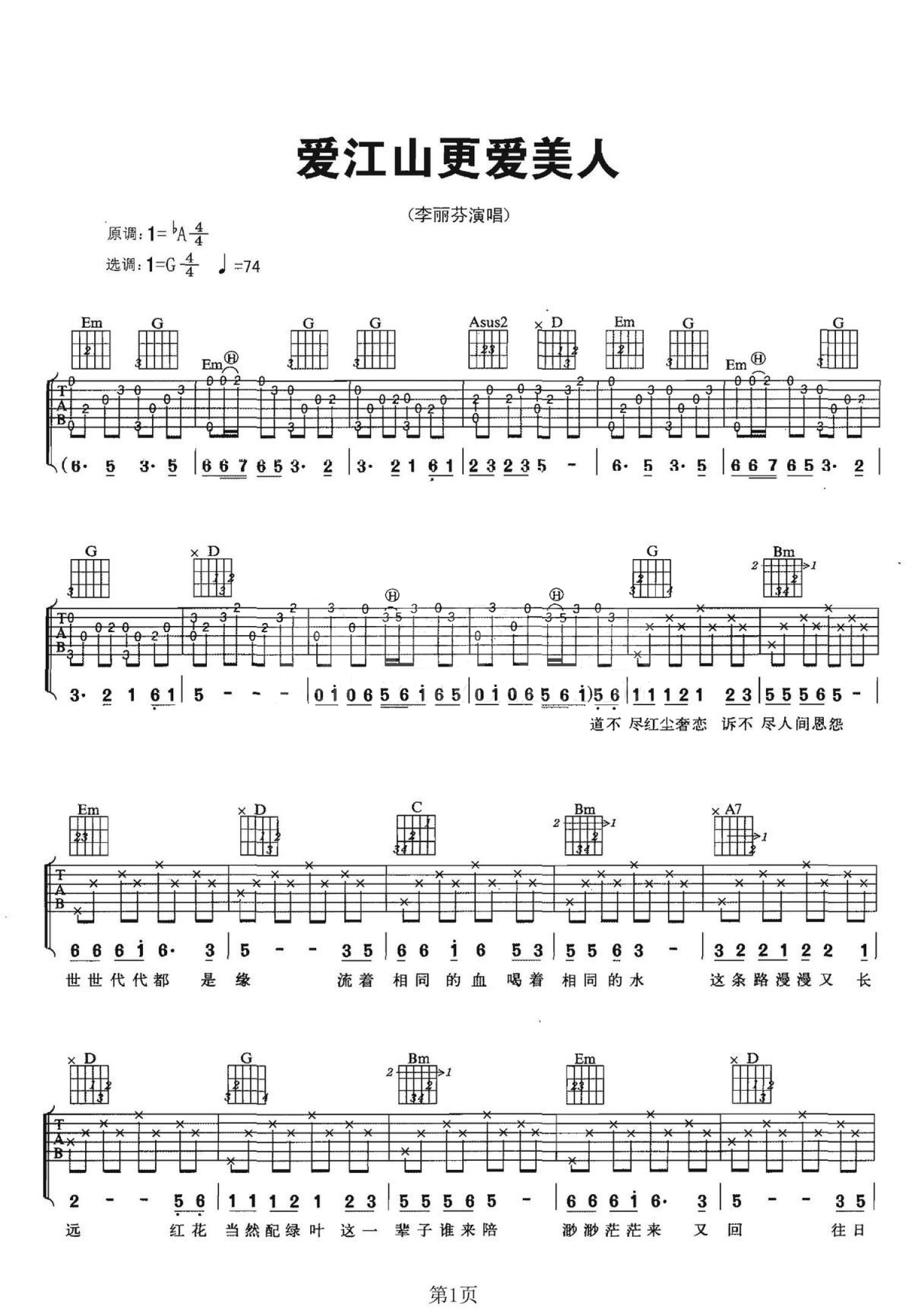 曲谱介绍: G调版李丽芬《爱江山更爱美人》吉他弹唱六线谱