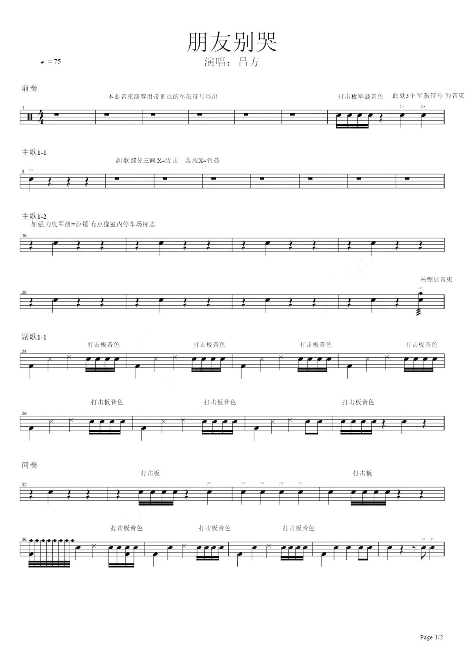 • 朋友别哭鼓谱 - 吕方 - 架子鼓谱第1张