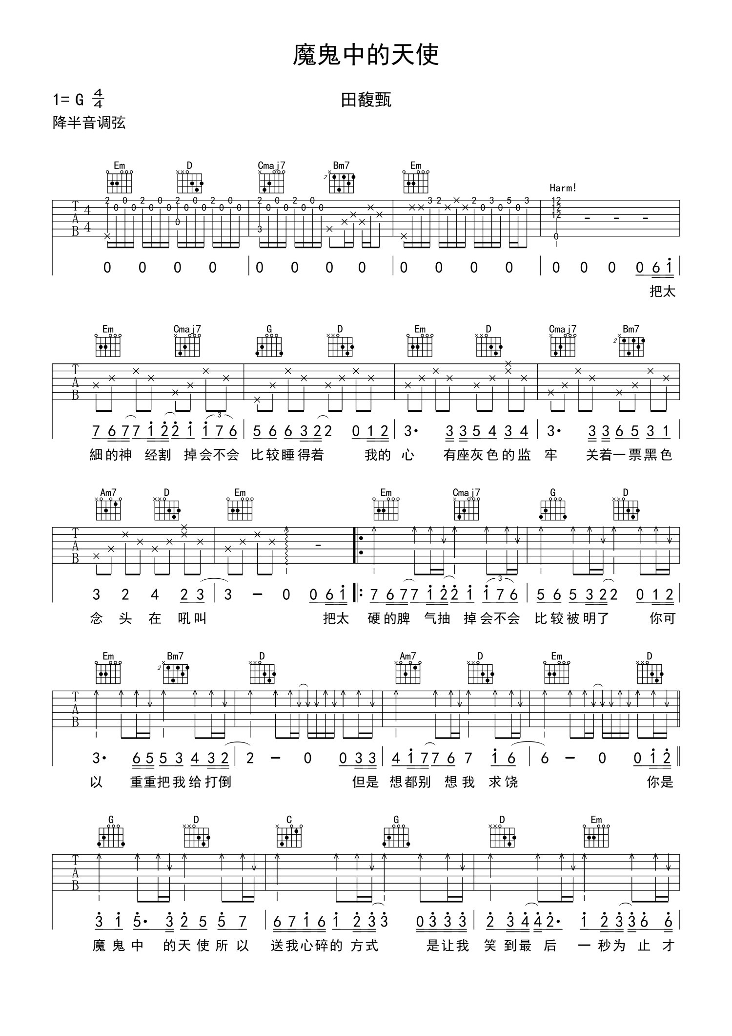 • 魔鬼中的天使吉他谱 - 田馥甄 - G调吉他弹唱谱第1张