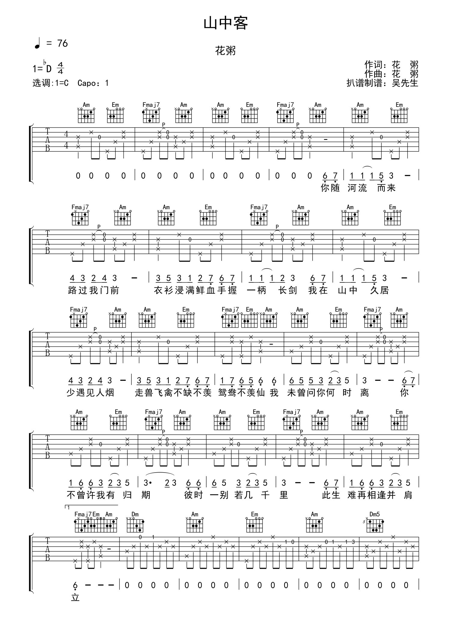 • 山中客吉他谱 - 花粥 - C调吉他弹唱谱第1张