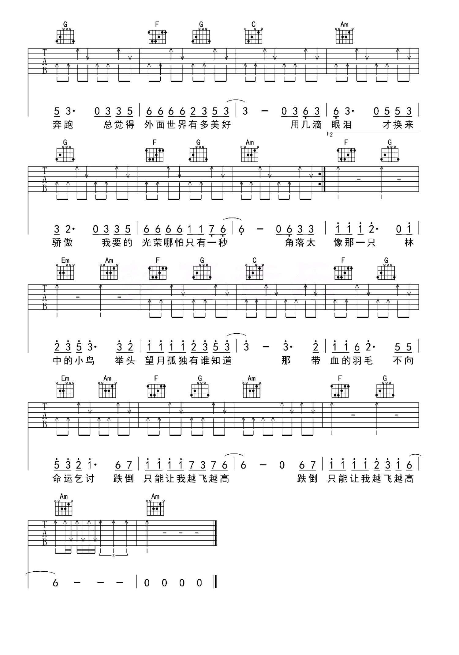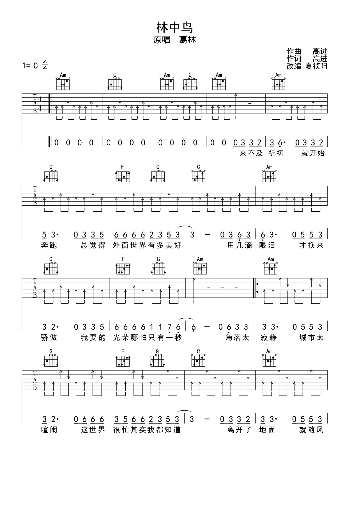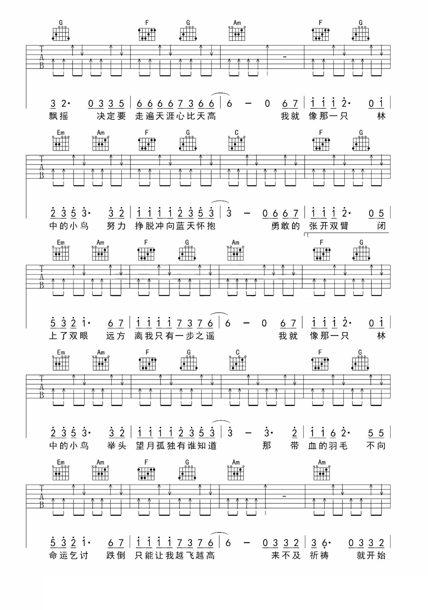 曲谱介绍: 中国好声音学员葛林与内地金牌音乐制作人高进合作作品《林中鸟》,致敬奋斗在路上的每个人,能勇敢冲破层层阻碍,像小鸟一样翱翔在蓝天之中,追逐自己的梦想,把握自己的幸福。歌曲的背景比较简单,旋律简单高亢,无论是旋律还是歌词,都能让在奋斗中的人感受到积极向上想要冲向蓝天的激情和拼搏精神。歌曲属于典型的流行摇滚风格,对演唱这首歌曲的歌手要求比较高,需要歌手的声音具备很强的爆发力。要点讲解:这首歌我编的比较简单,常规的和弦,基本从头到位都是一个节奏。整首歌曲节奏感比较强,节奏应该还是比较容易把控的。前奏简单的旋律是两把吉他完成的,在吉他谱上并没有把旋律谱写上,很简单的7117,大家找到这两个音就能弹了,对于现场弹唱来说我觉得也没必要。这首歌曲的难点还是在唱的部分,到了高潮需要很强的声音爆发力。以前很多跟我学唱歌的学生问我高音怎么唱,我说就是用气息顶,声音的力度在于歌手丹田的力量,而不是嗓子用力。我个人的声音其实并不适合唱这首歌,但是在这首歌曲里,大家可以感受一下我对气息的运用,如何来完成高潮部分的高音。