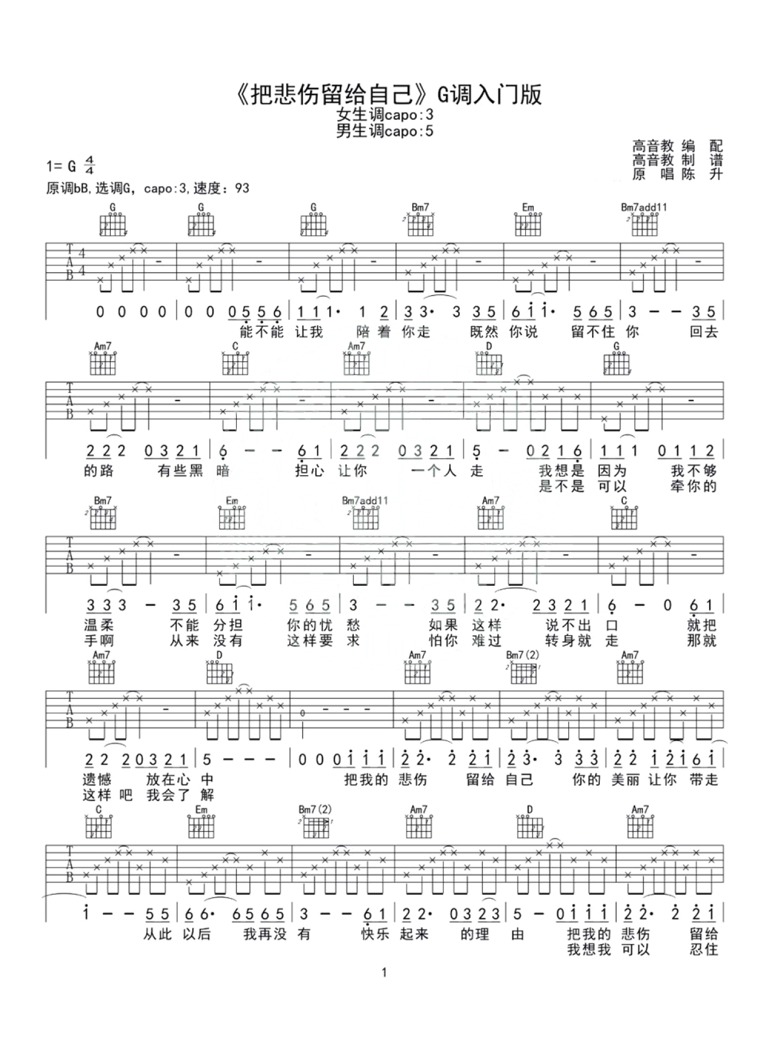 曲谱介绍: 《把悲伤留给自己》吉他谱G调入门版 高音教编配
