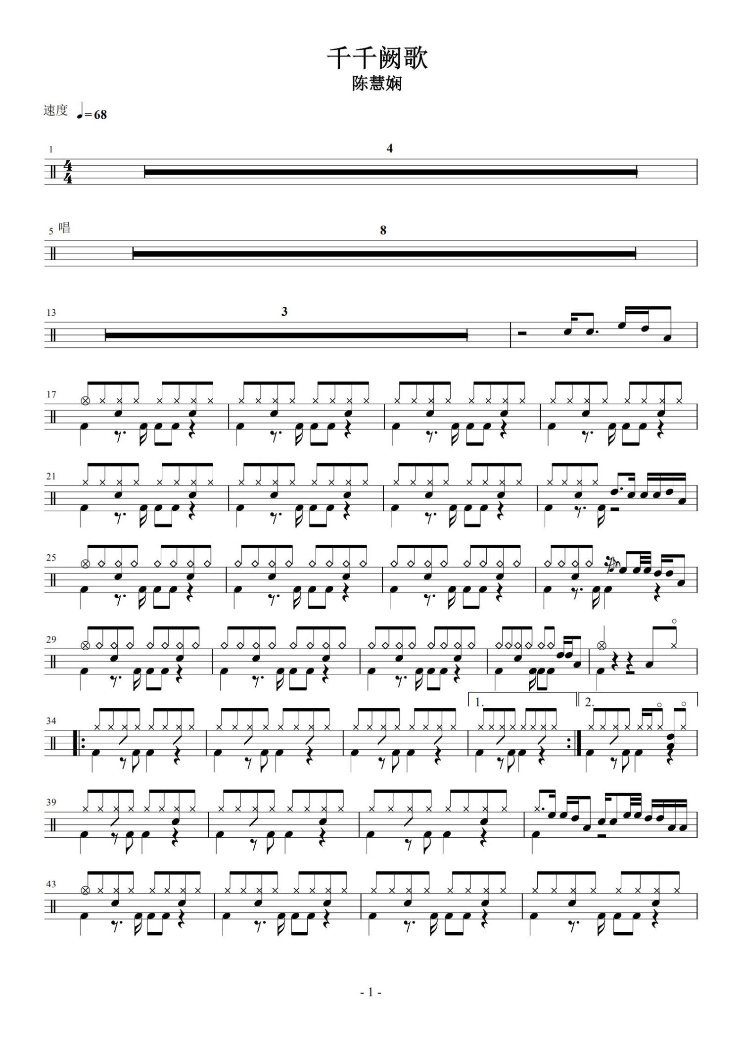 • 千千阙歌鼓谱 - 陈慧娴 - 架子鼓谱第1张