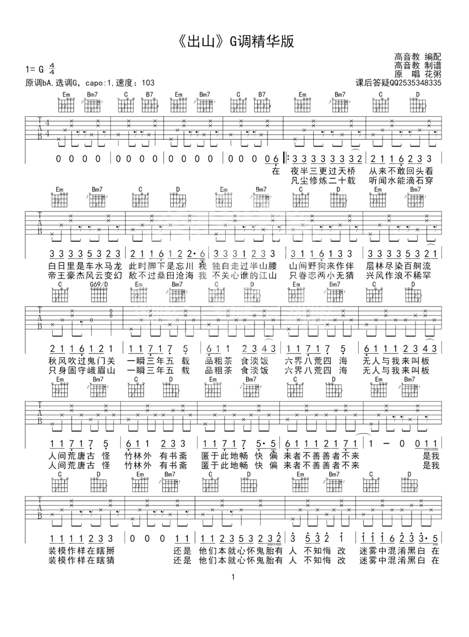曲谱介绍: 花粥《出山》吉他谱_G调吉他弹唱谱