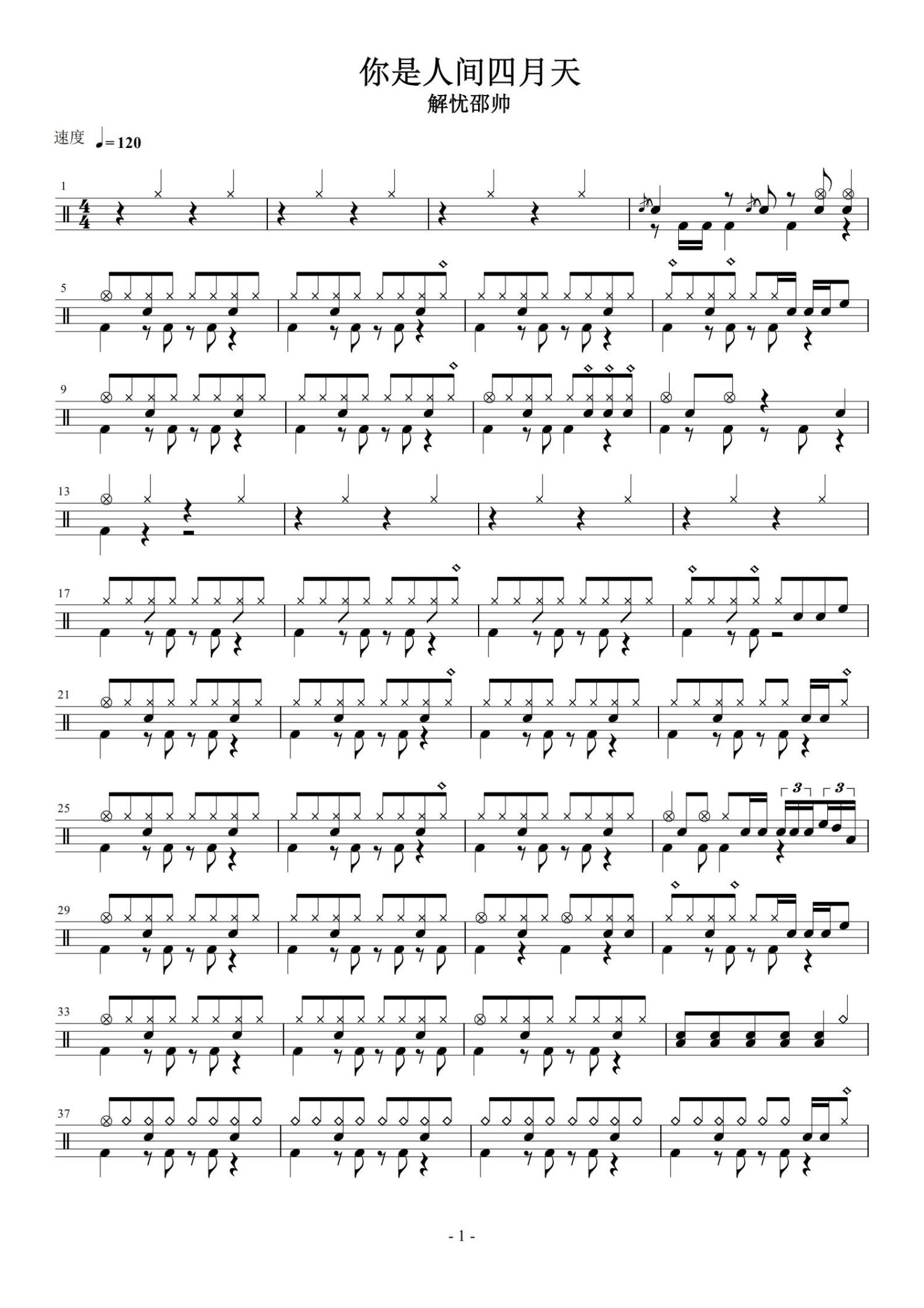 • 你是人间四月天鼓谱 - 解忧邵帅 - 架子鼓谱第1张