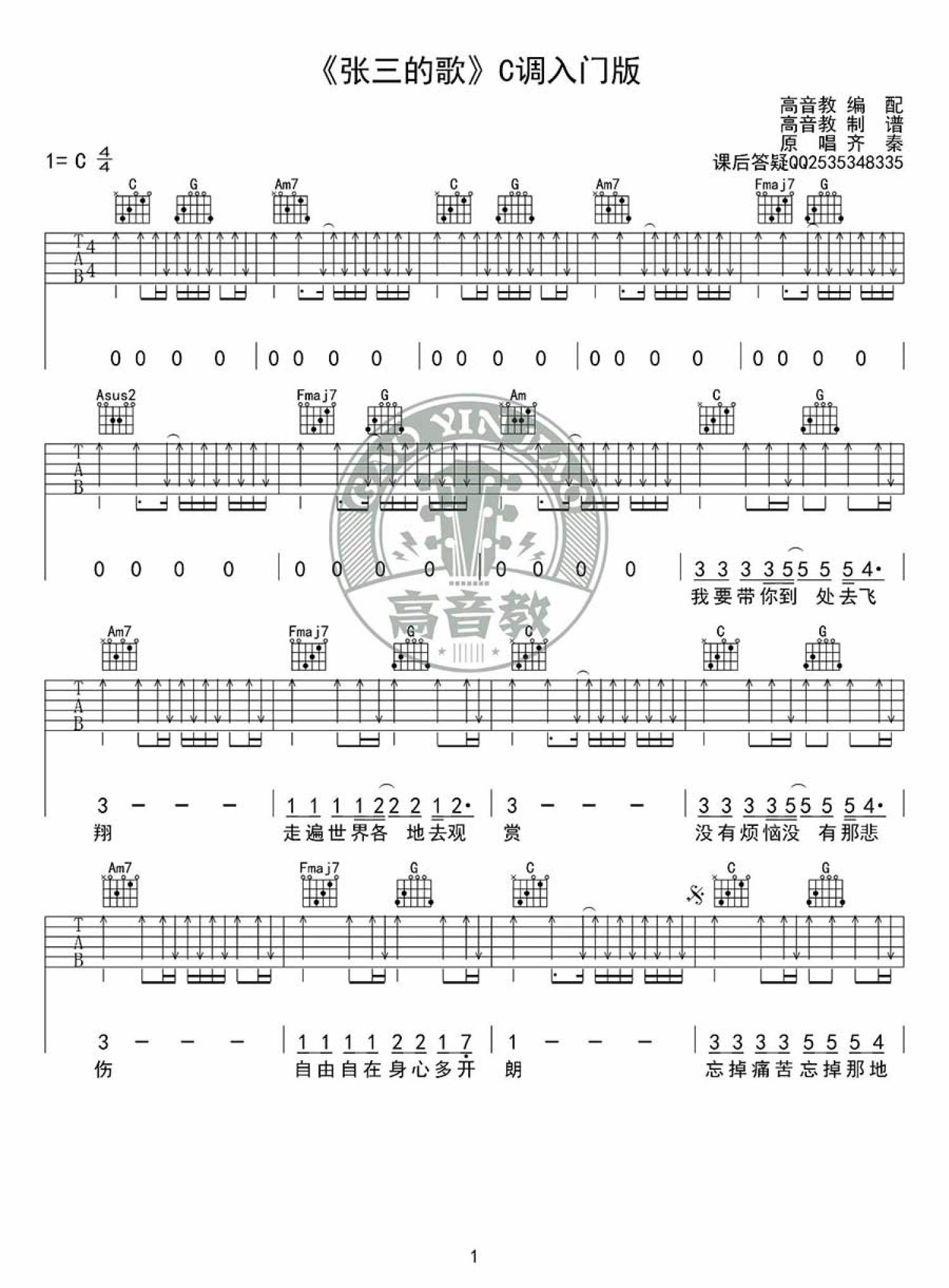 曲谱介绍: 《张三的歌》C调入门版吉他谱