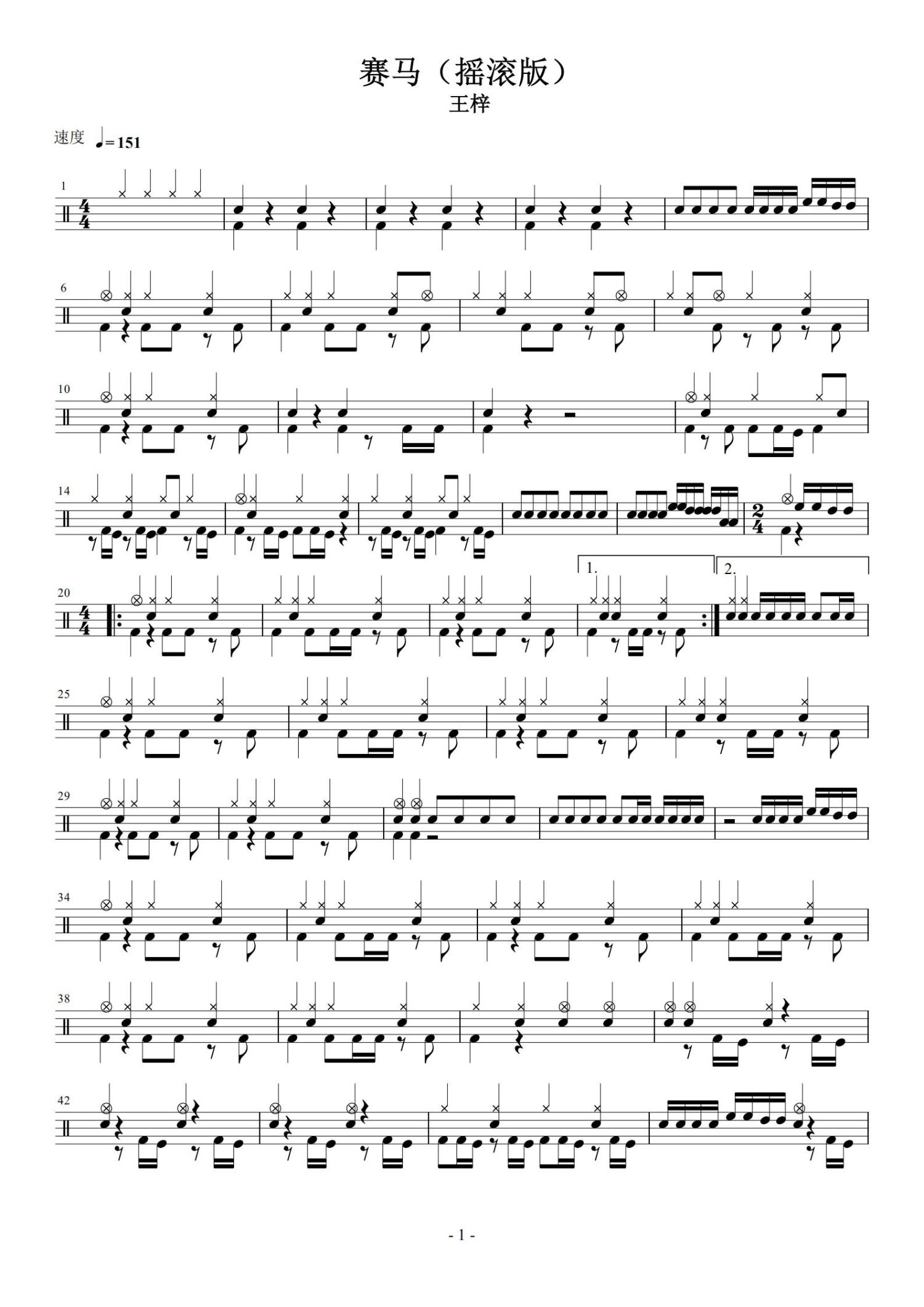 • 赛马鼓谱 - 王梓 - 架子鼓谱 - 摇滚版第1张