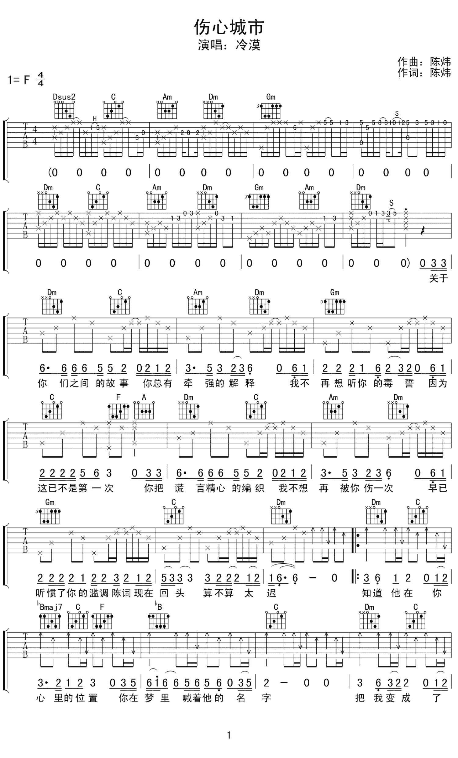 伤心城市吉他谱 - 冷漠 - 吉他弹唱谱