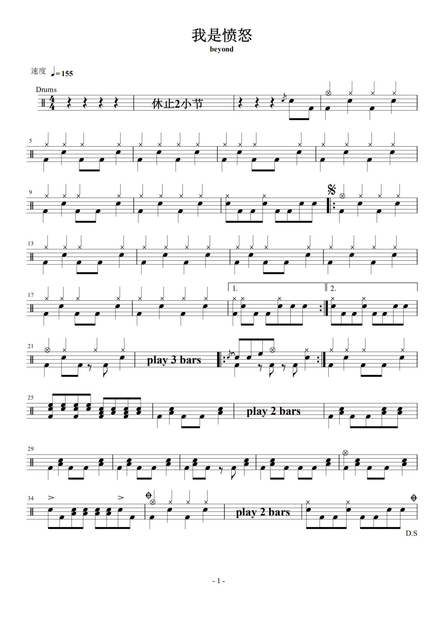 • 我是愤怒鼓谱 - Beyond - 架子鼓谱第1张