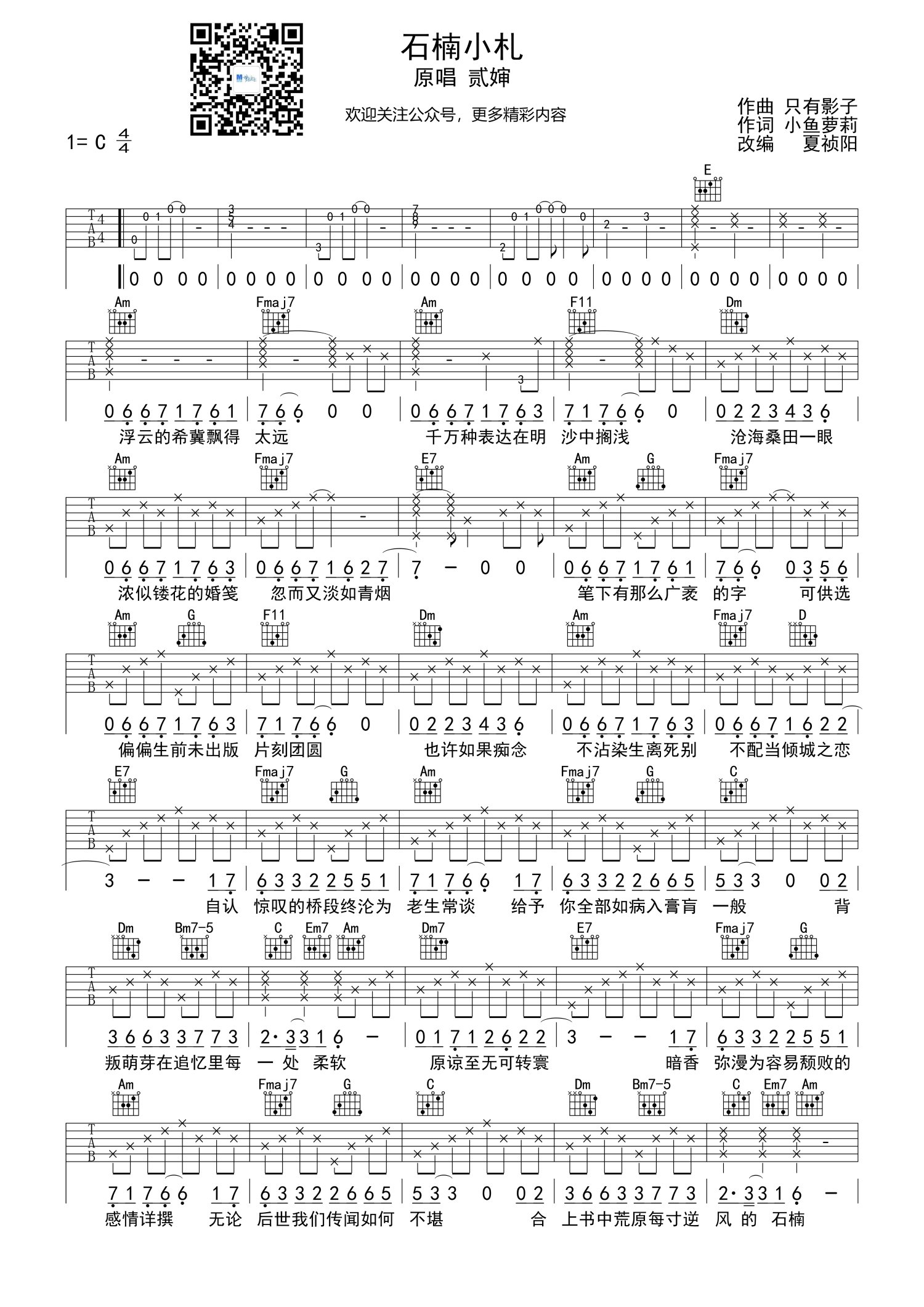 石楠小札吉他谱 - 贰婶 - C调吉他弹唱谱