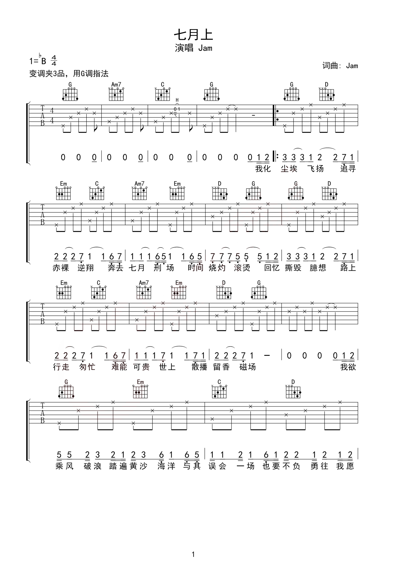 七月上吉他谱 - Jam - G调吉他弹唱谱