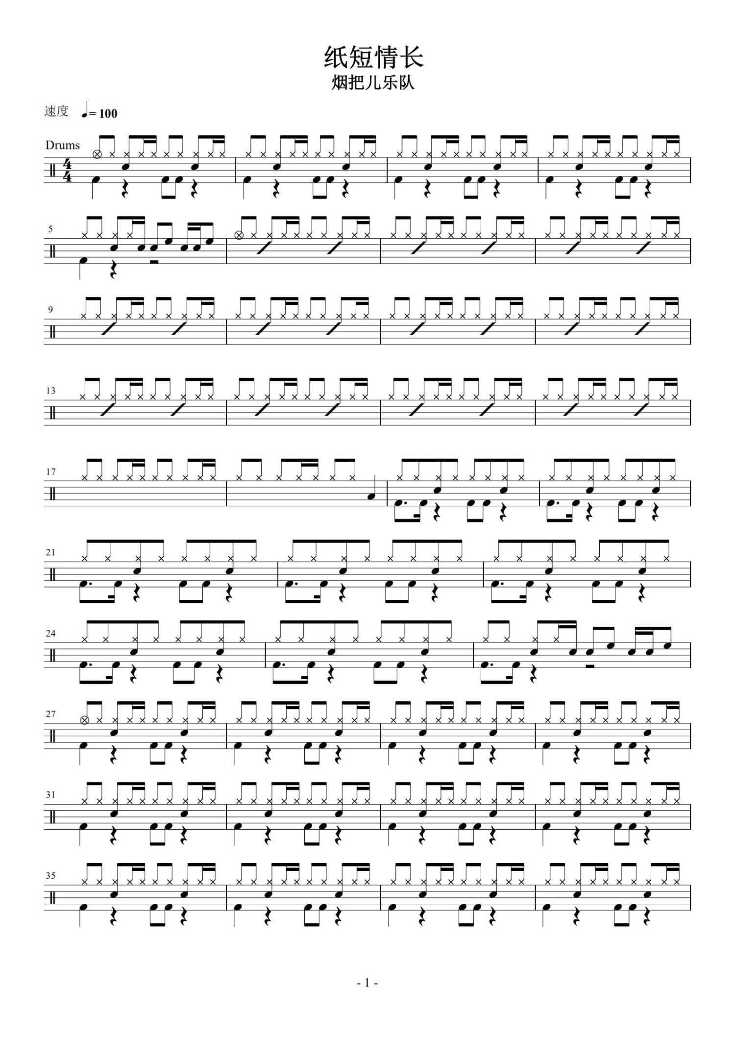 • 纸短情长鼓谱 - 烟把儿乐队 - 架子鼓谱第1张