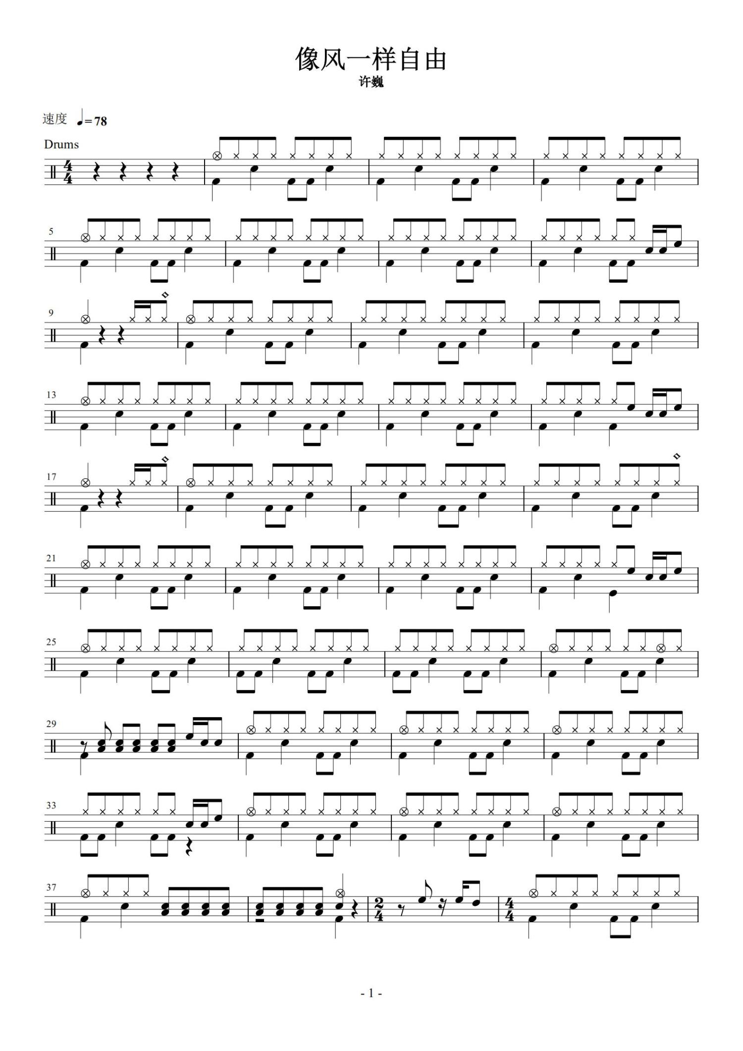 • 像风一样自由鼓谱 - 许巍 - 架子鼓谱第1张