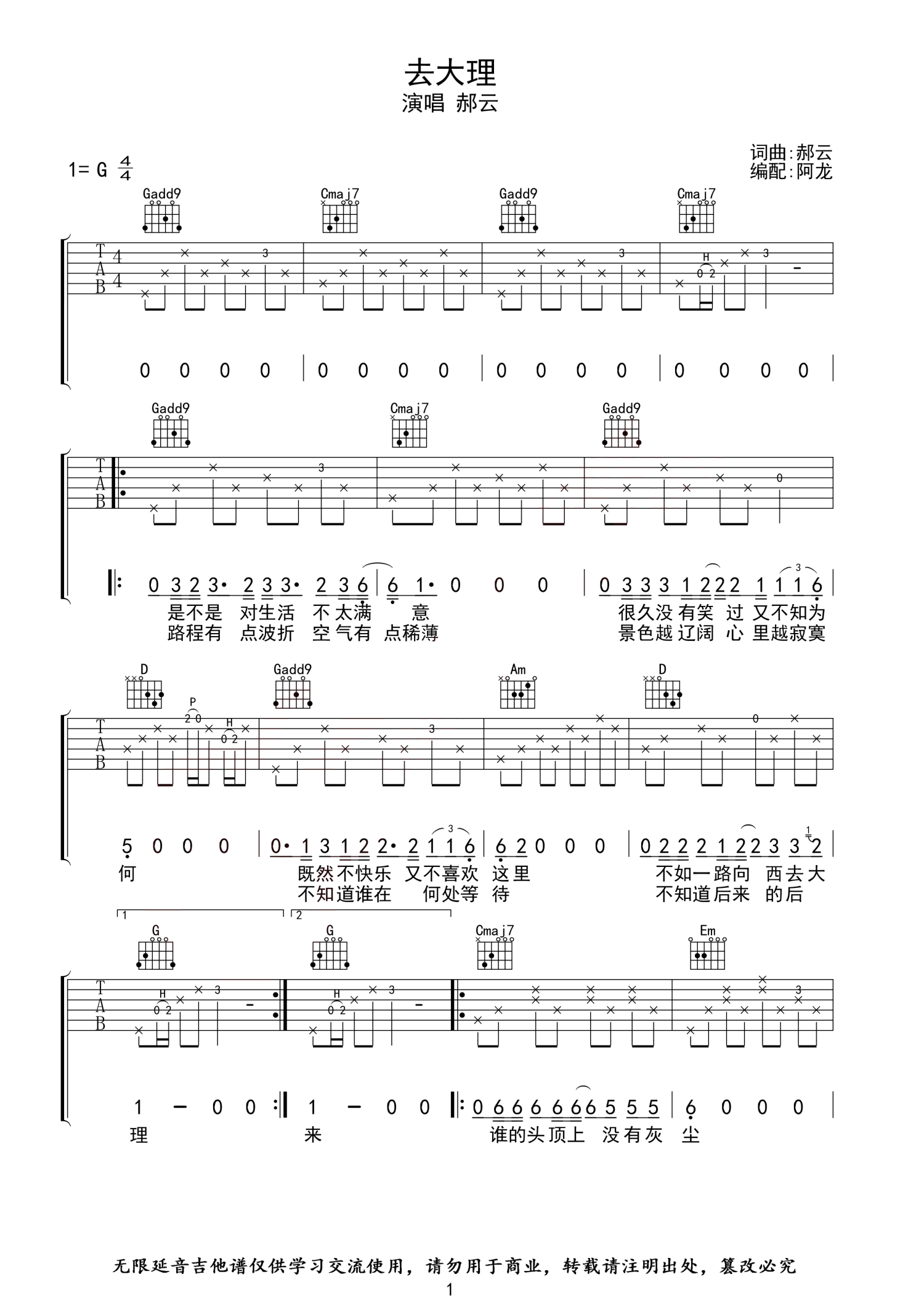 曲谱介绍: 一首饱含冯氏幽默的《群发的我不回》,让郝云成为马年春晚最大的“黑马”,迅速得到亿万观众热捧。但鲜少有人知道,促使郝云和冯小刚结缘,并碰撞出灿烂火花的真正“月老”是导演宁浩。一次机缘巧合,郝云被曾经在舞蹈学院教过的学生推荐给了宁浩,之前就对彼此非常欣赏的两人一见如故,谈到新电影的话题时,郝云更是提出很多让宁浩眼前一亮的想法。宁浩当即邀请郝云为其全新力作《心花路放》量身打造一首专属情感插曲。郝云亦不负所望交出一首文艺气息十足、略带沉重的《去大理》。虽为首次合作,但宁浩称其非常精准地诠释了黄渤和徐峥这趟“一路向西“旅程的遭遇及状态,同时让大家在笑出声的同时又流下感动的泪水,笑中含泪地感受喜剧的真正魅力。 巨匠娱乐旗下歌手郝云全新创作单曲《去大理》于2014年8月22日全网首发,这首《去大理》被宁浩导演用于全新力作电影《心花路放》作插曲。郝云的单曲《去大理》被封为最疗伤民谣 ,翻起一阵去大理的热潮。 《去大理》整首歌延续郝云以往的唱作风格,以清新民谣为主,略带中年男人的沉重和感怀,讲述了黄渤、徐峥两人一路向西的故事。但在延续中推陈出新,郝云将他自身在大理旅行中的经历和情感同电影情节相结合,想象自己就是片中面对爱情难题不知所措的主人公耿浩(黄渤饰),唱出中年男人所特有的沉重和感怀,整首歌只应用吉他一种乐器搭配独有的“云式”唱腔,最简单也最直接地云式创作,带来最淳朴最真挚的心灵震撼。
