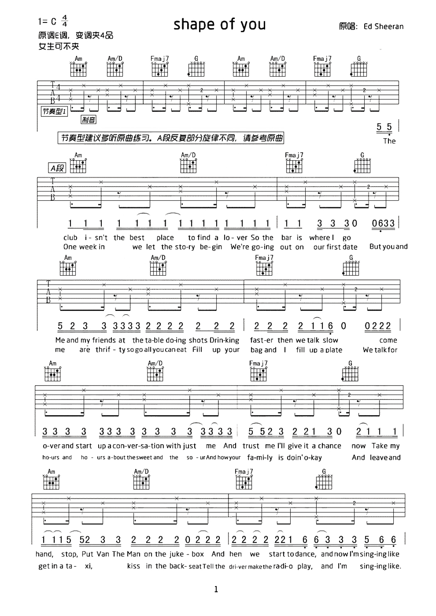 Shape of You吉他谱 - 国外Ed Sheeran - C调吉他弹唱谱