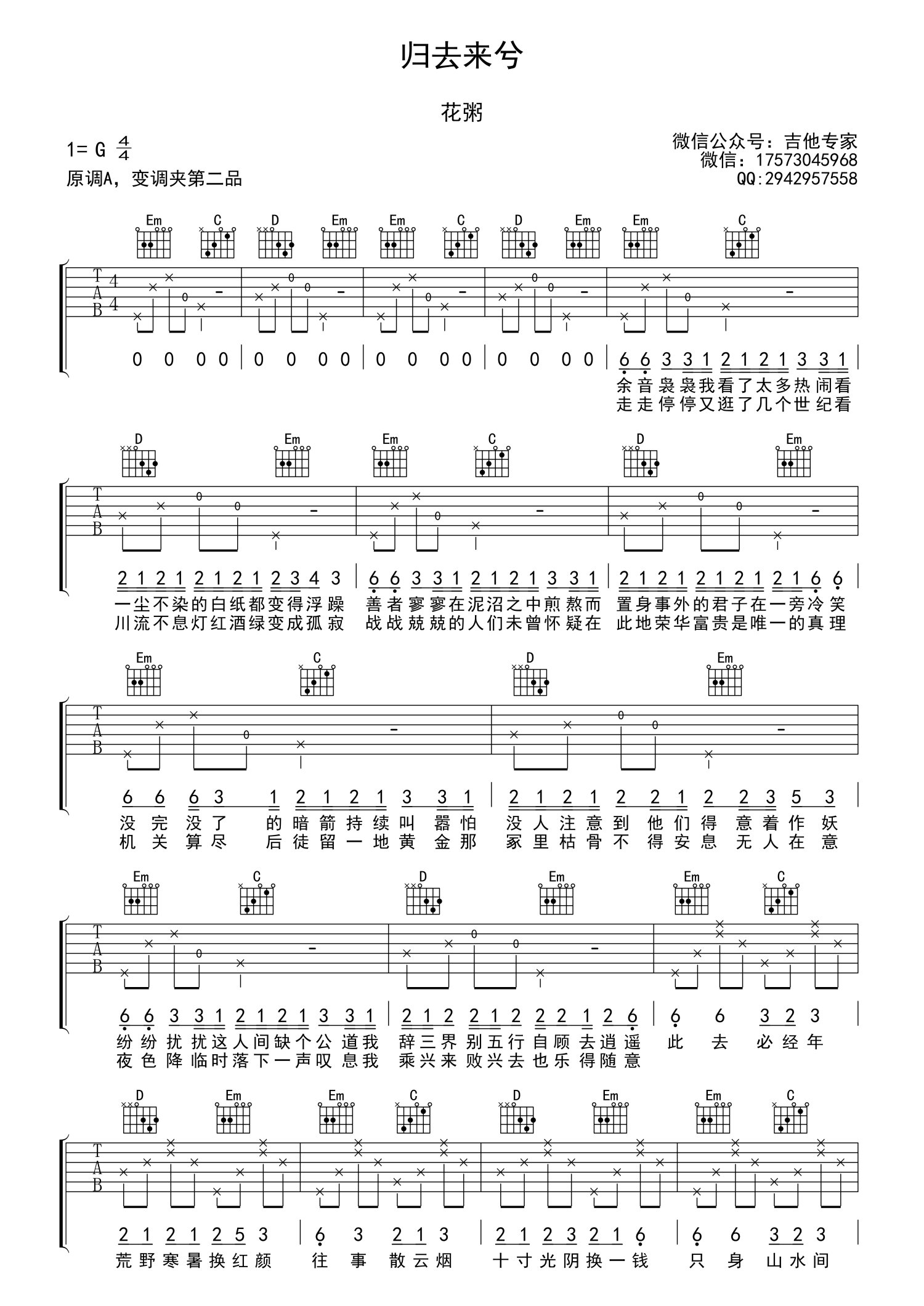 归去来兮吉他谱 - 花粥 - G调吉他弹唱谱
