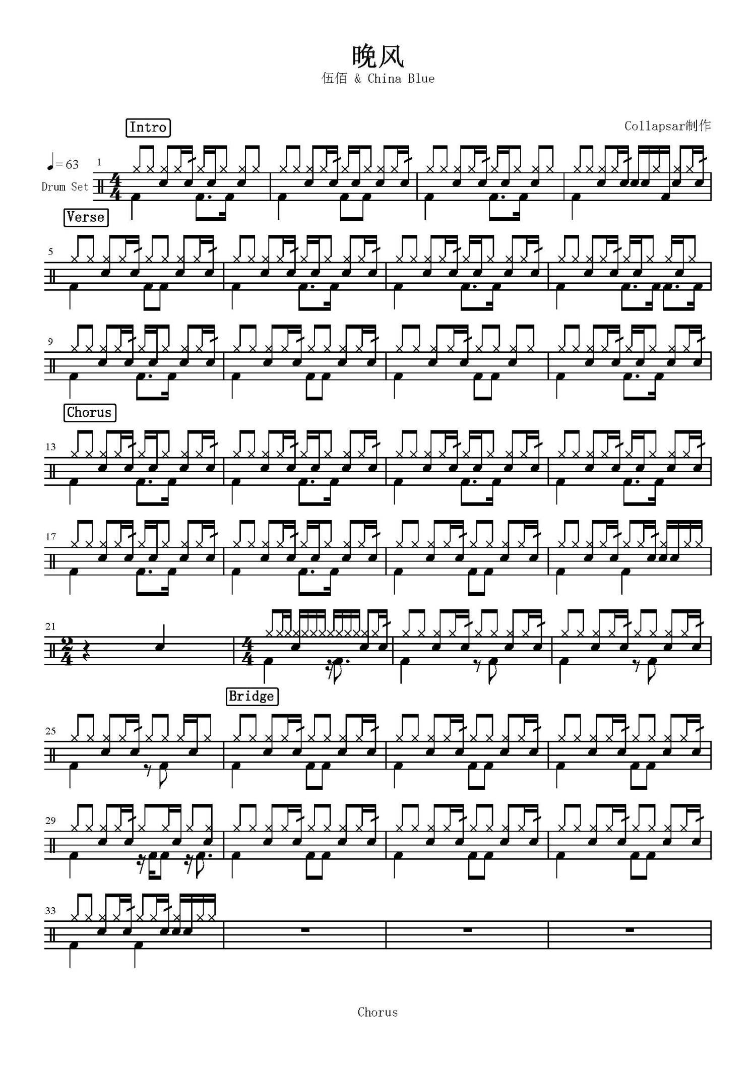 • 晚风鼓谱 - 伍佰/China Blue - 架子鼓谱第1张