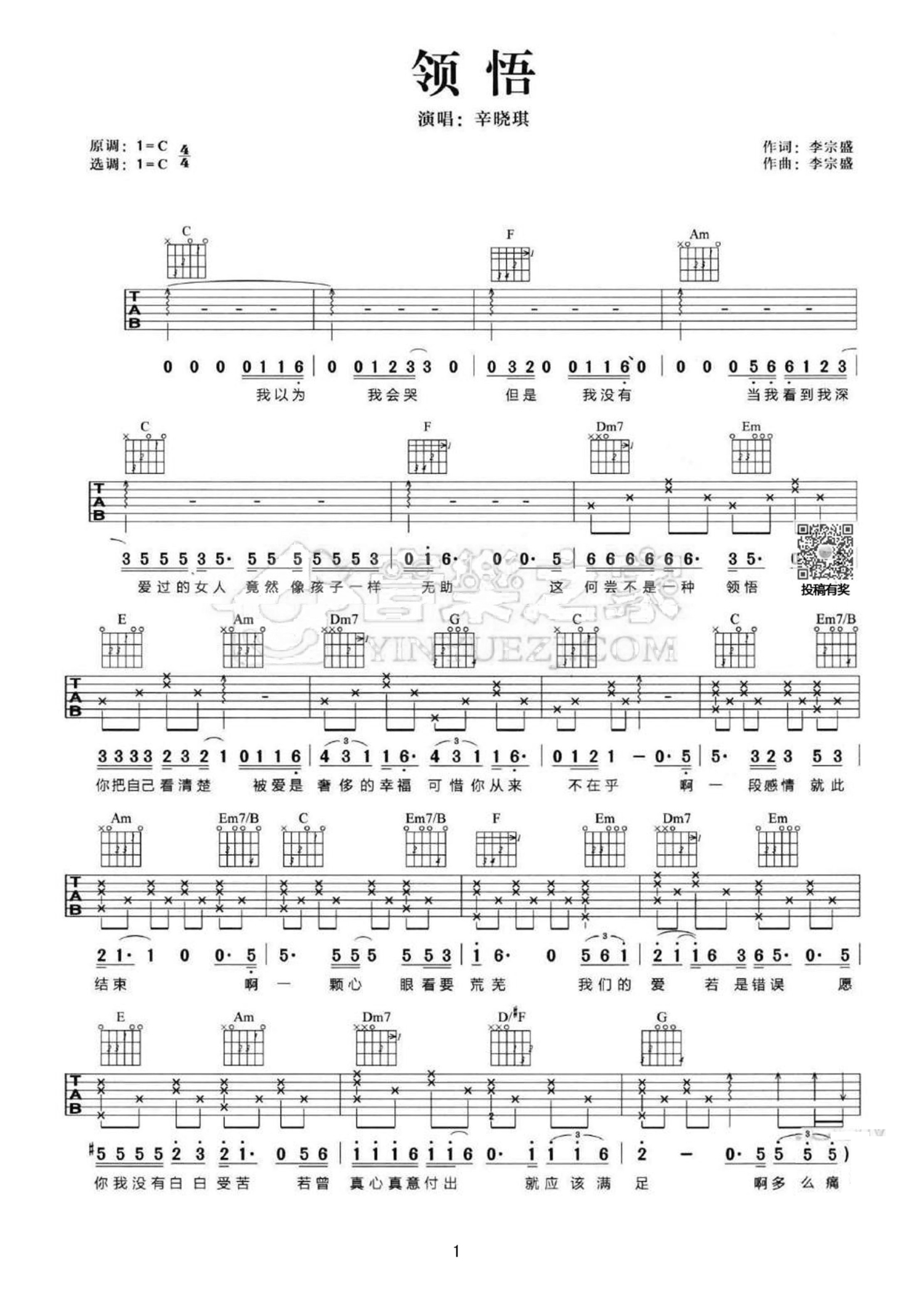曲谱介绍: 辛晓琪《领悟》吉他谱C调简单弹唱版