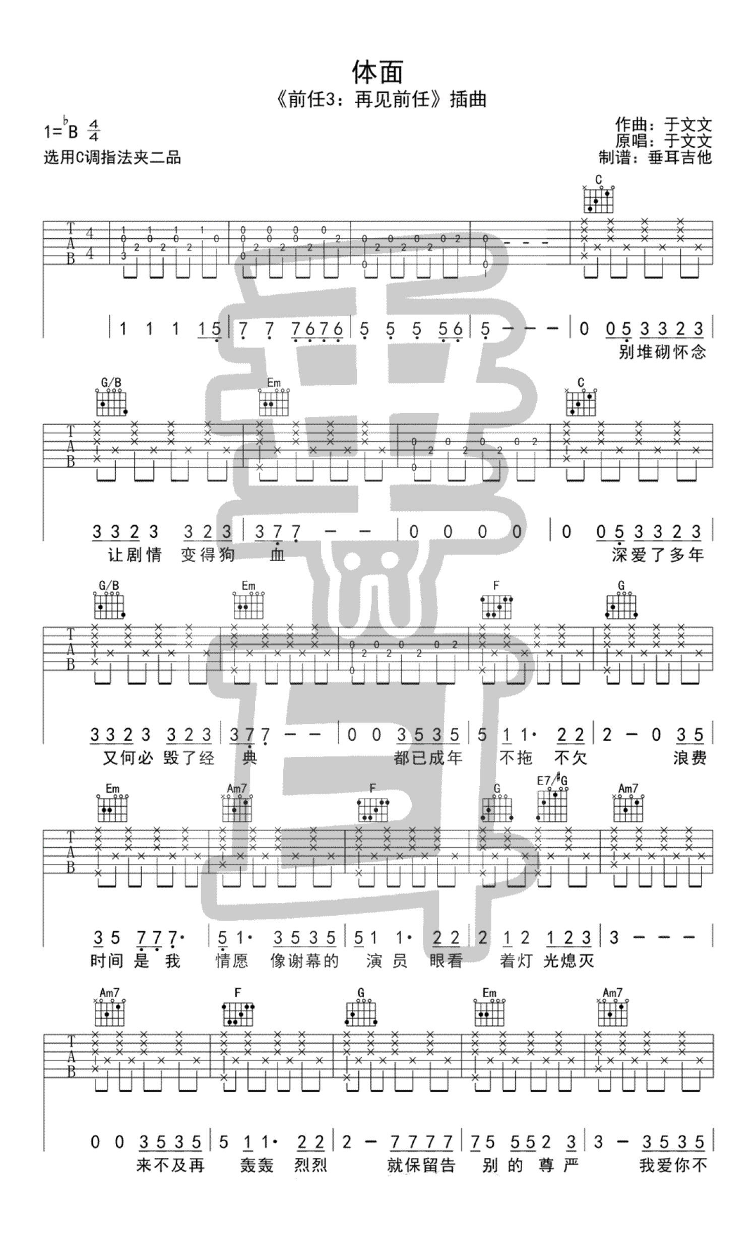曲谱介绍: 于文文《体面》吉他谱,原调降B,选用C调指法,变调夹夹第二品。体面吉他弹唱谱,电影《前任三》插曲,于文文词曲演唱。为各自留些情面和余地,不辜负曾经的挚诚,不辜负自己。