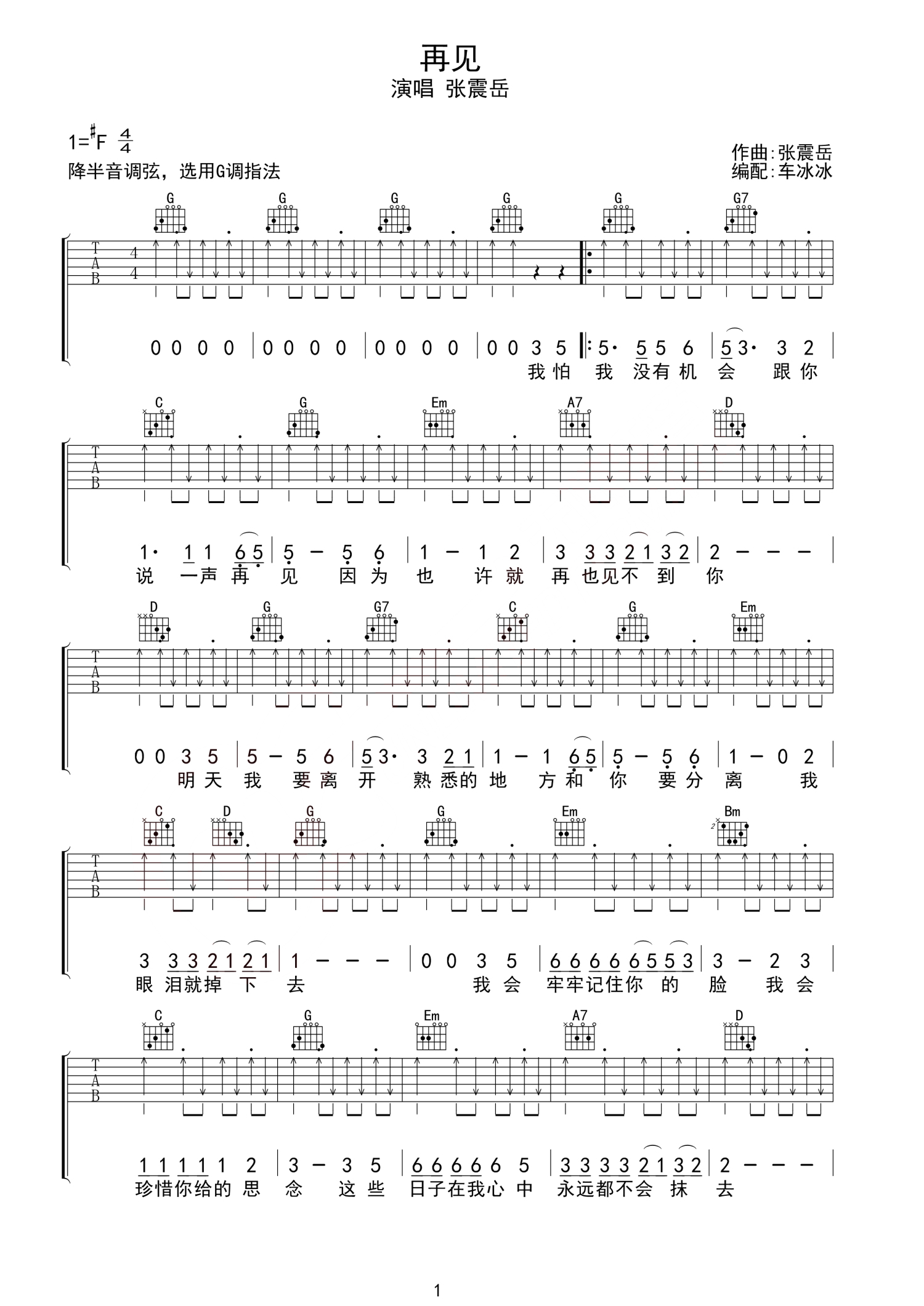 再见吉他谱 - 张震岳 - G调吉他弹唱谱