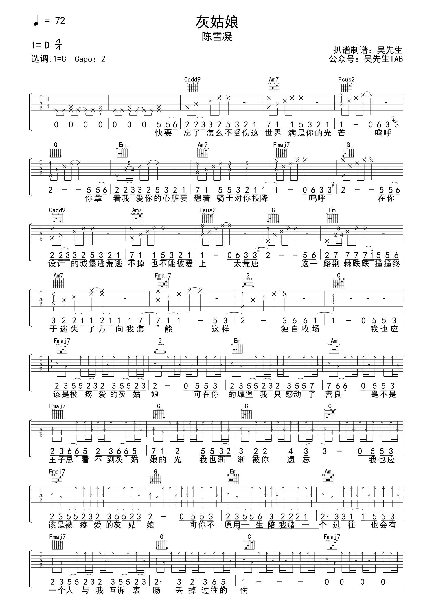 • 灰姑娘吉他谱 - 陈雪凝 - C调吉他弹唱谱第1张