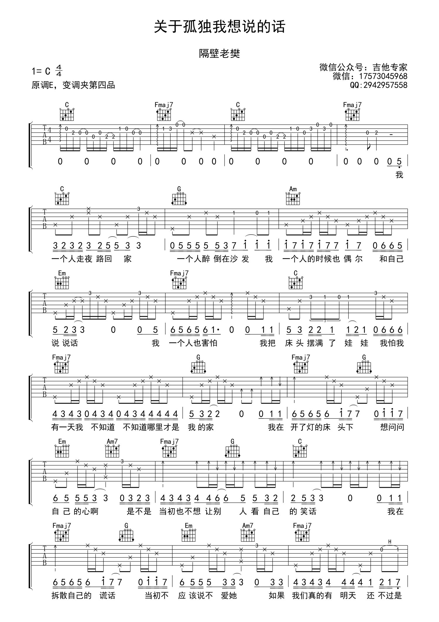 关于孤独我想说的话吉他谱 - 隔壁老樊 - C调吉他弹唱谱