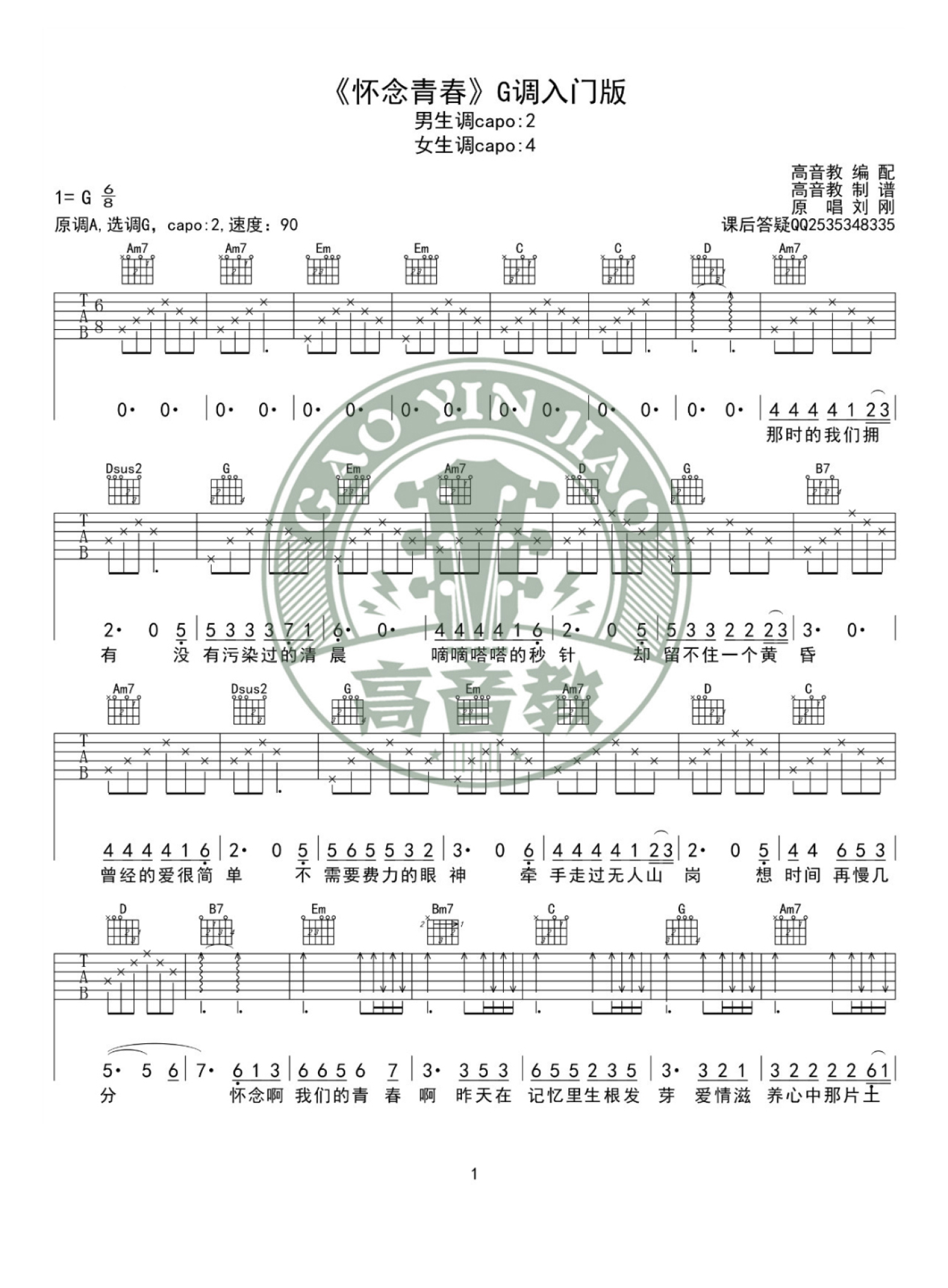 怀念青春吉他谱 - 刘刚 - G调吉他弹唱谱