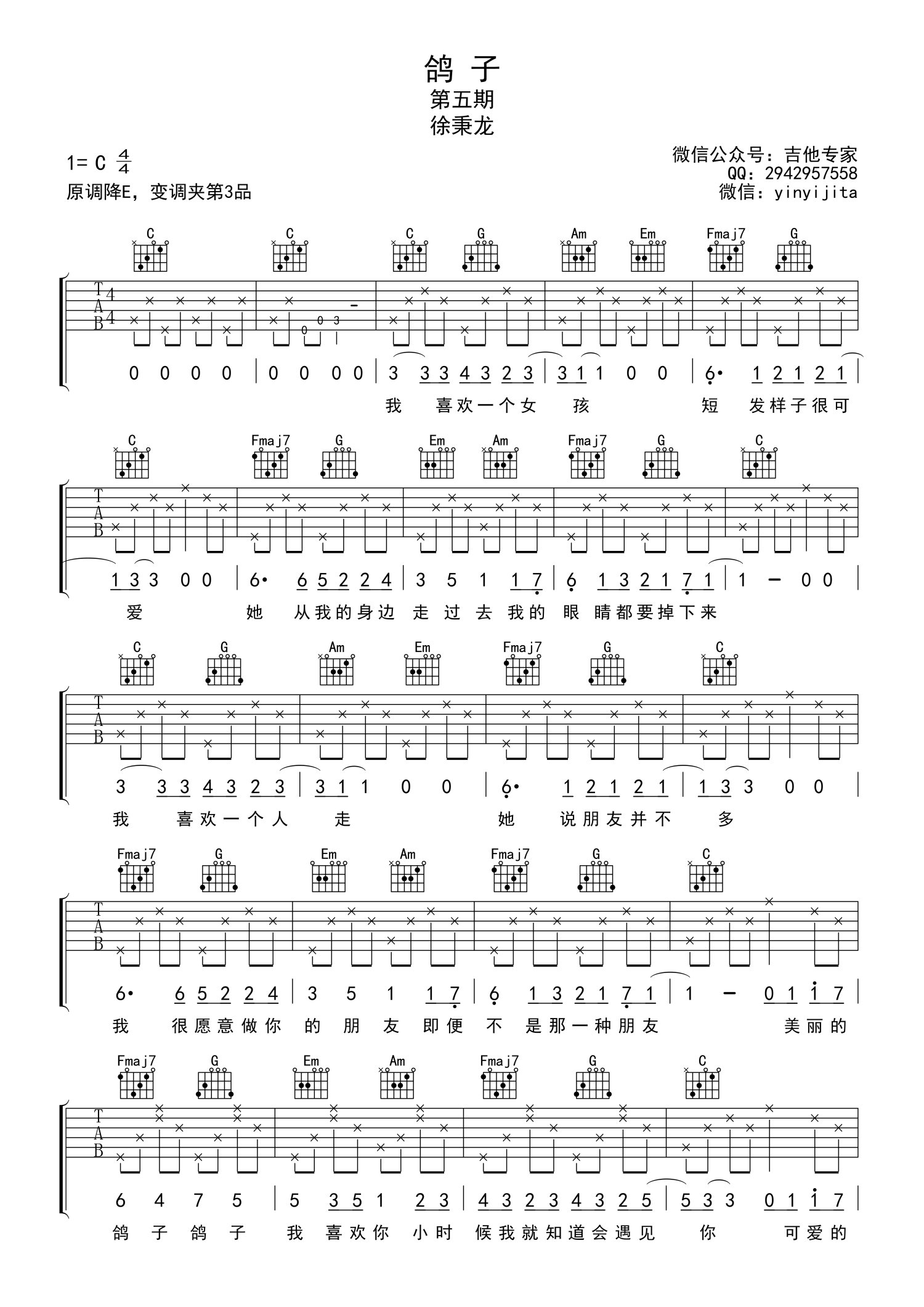 • 鸽子吉他谱 - 徐秉龙 - C调吉他弹唱谱第1张