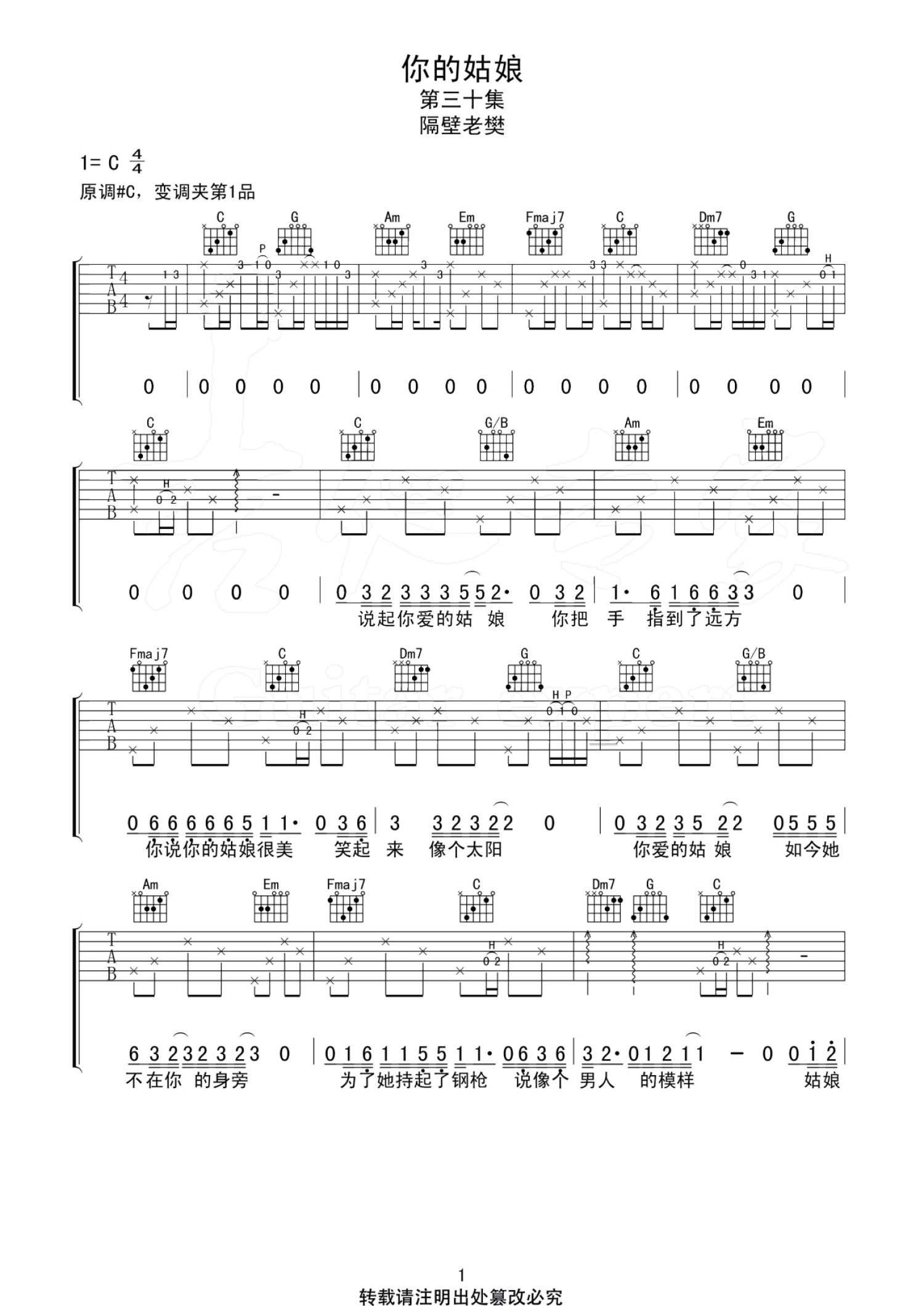 你的姑娘吉他谱 - 隔壁老樊 - C调吉他弹唱谱