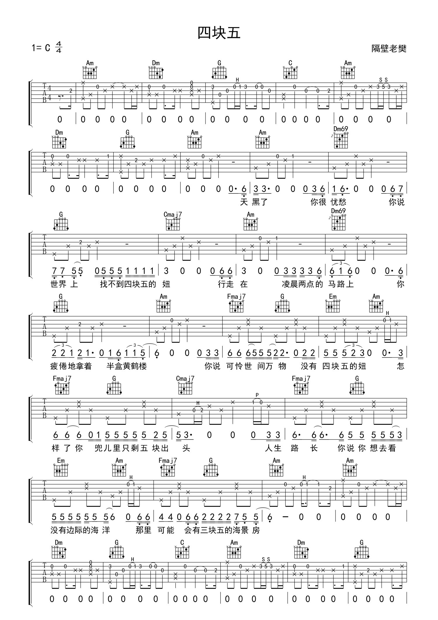 • 四块五吉他谱 - 隔壁老樊 - C调吉他弹唱谱第1张