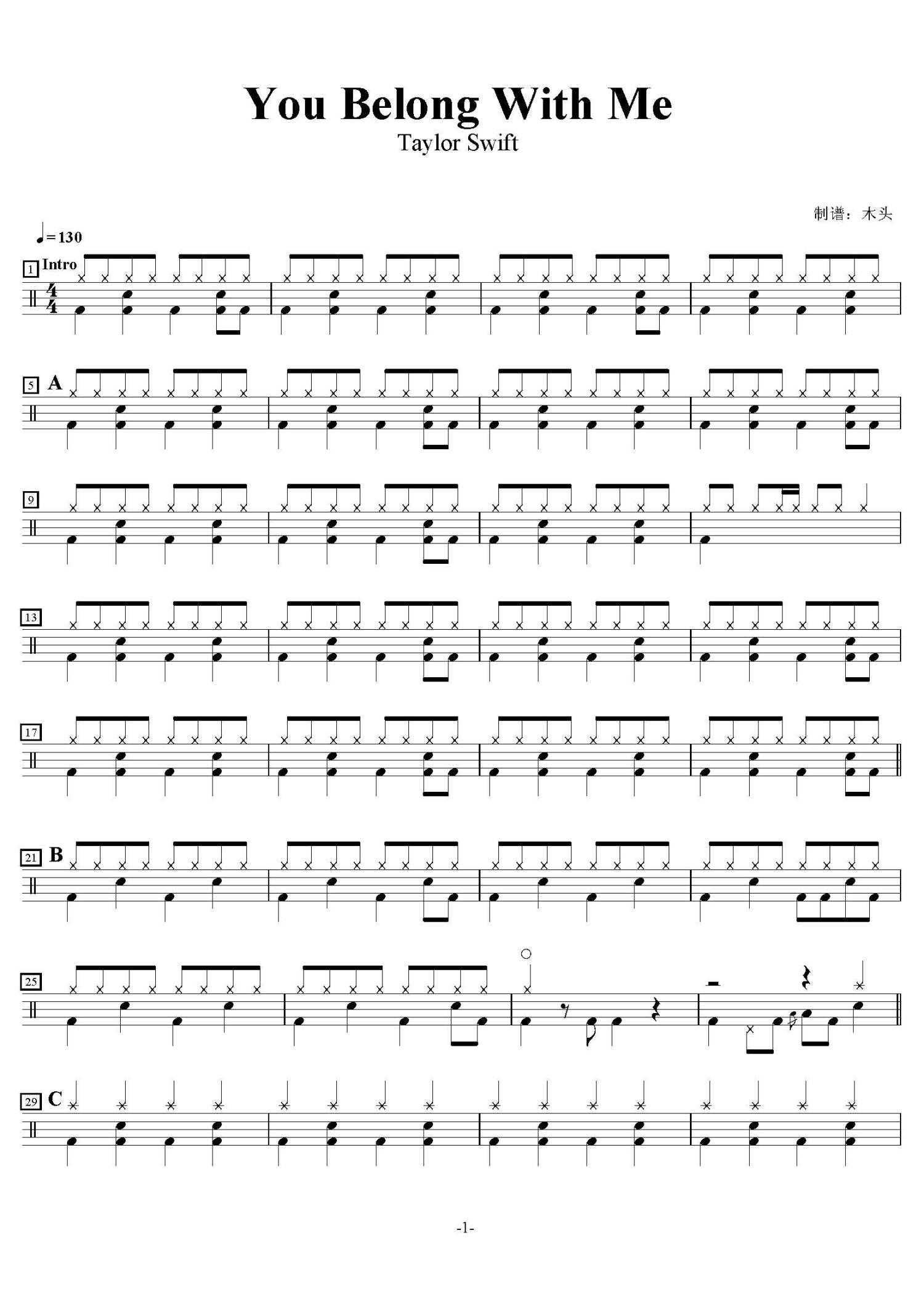 You Belong With Me鼓谱 - Taylor Swift - 架子鼓谱
