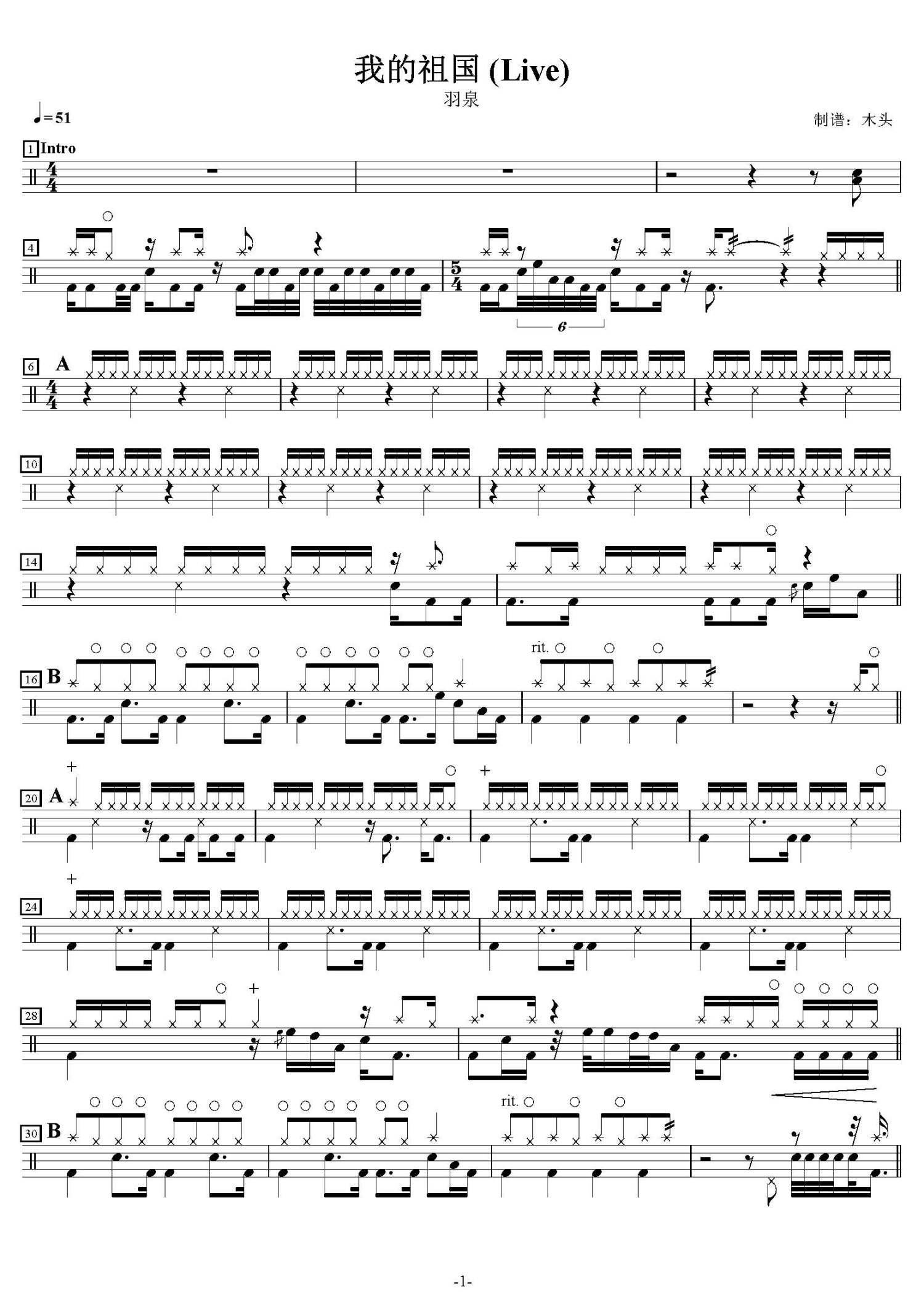 我的祖国鼓谱 - 羽泉 - 架子鼓谱 - Live