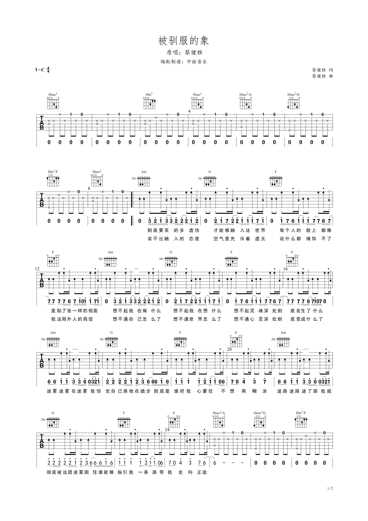 • 被驯服的象吉他谱 - 蔡健雅 - C调吉他弹唱谱第1张