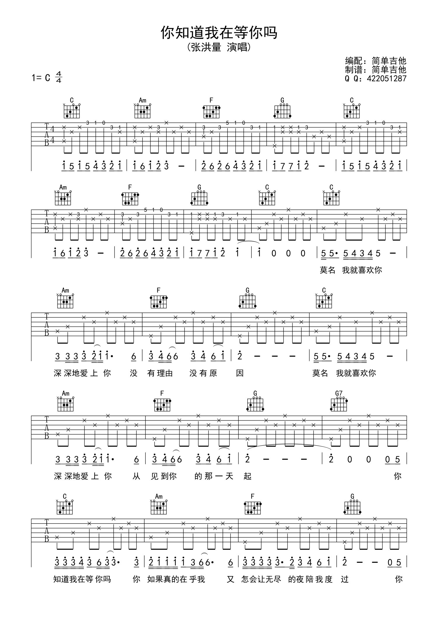 • 你知道我在等你吗吉他谱 - 张洪量 - C调吉他弹唱谱第1张