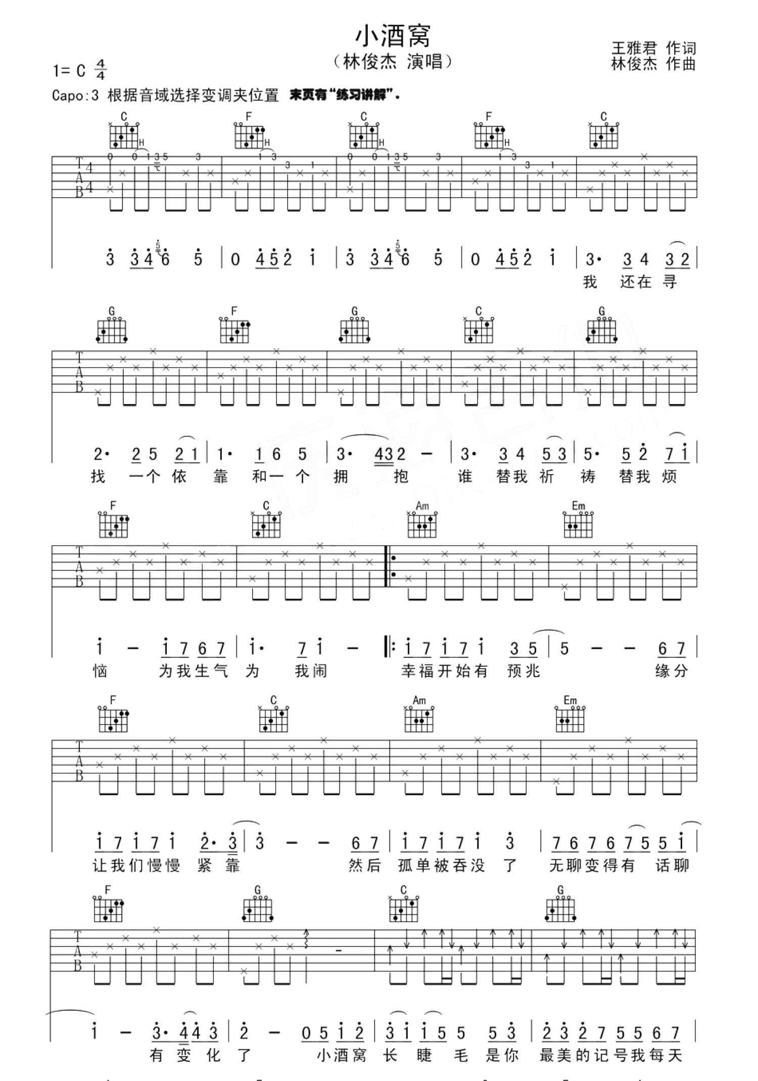 • 小酒窝吉他谱 - 林俊杰 - C调吉他弹唱谱第1张