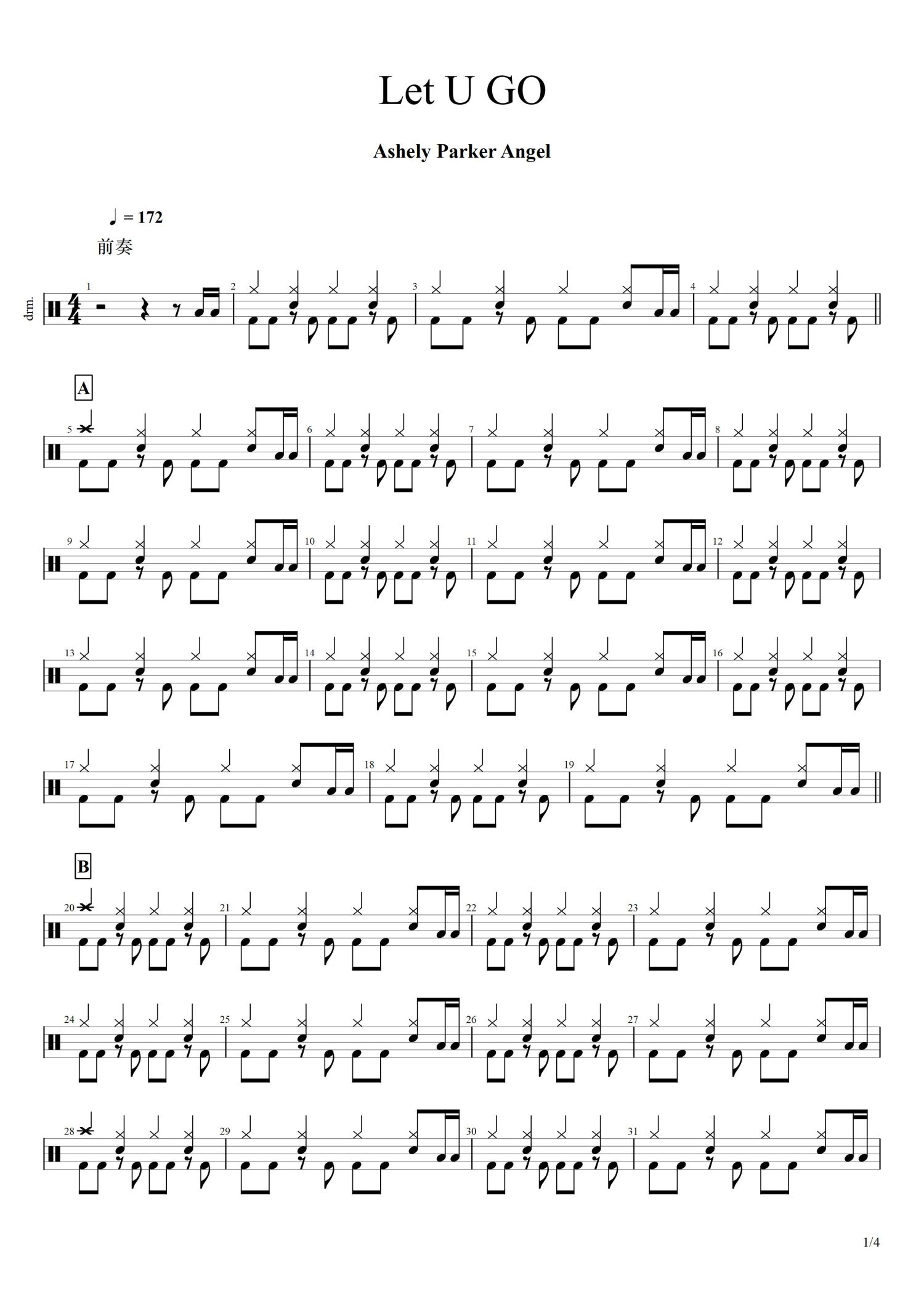 • Let U GO鼓谱 - Ashely Parker Angel - 架子鼓谱第1张