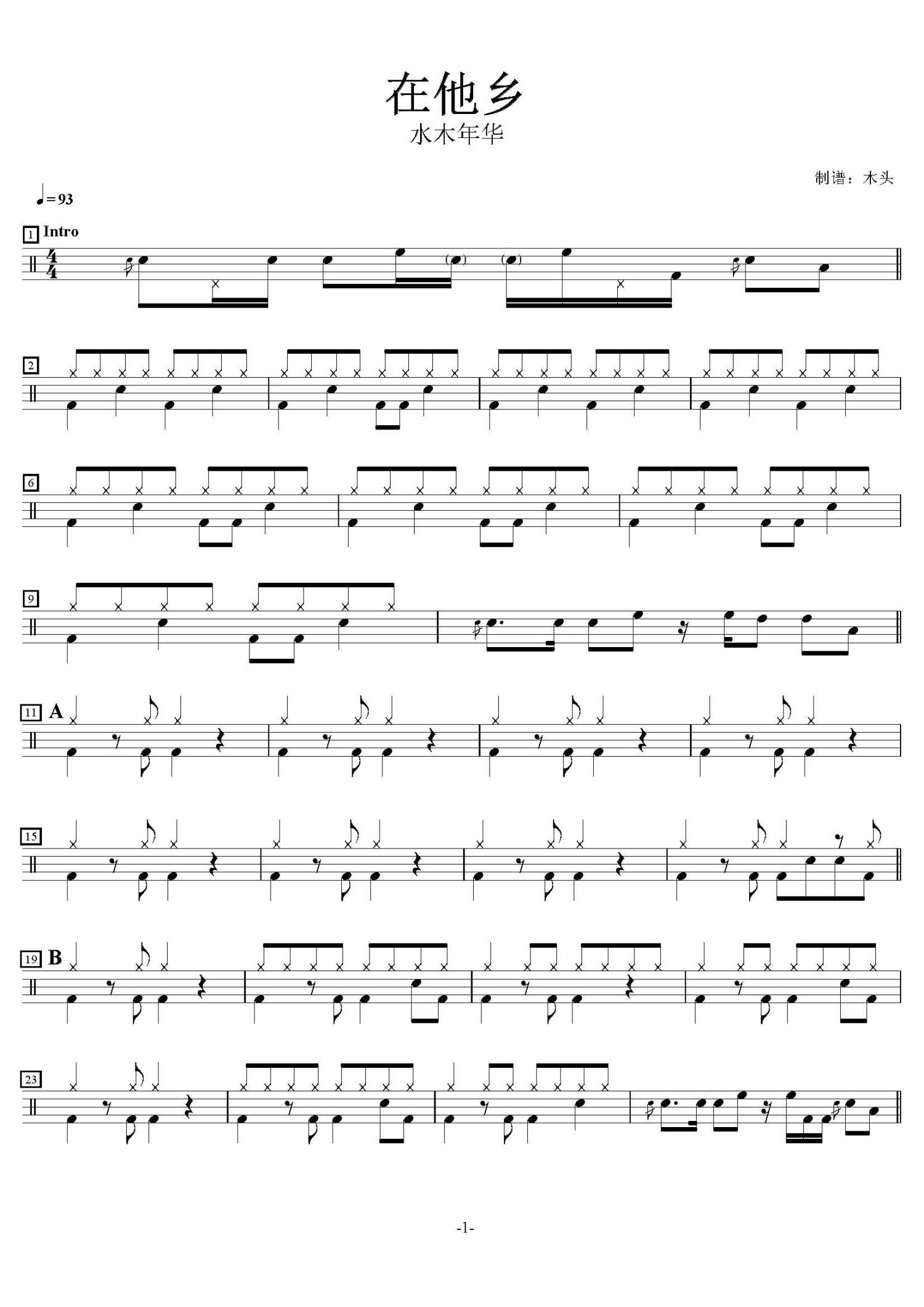 • 在他乡鼓谱 - 水木年华 - 架子鼓谱第1张