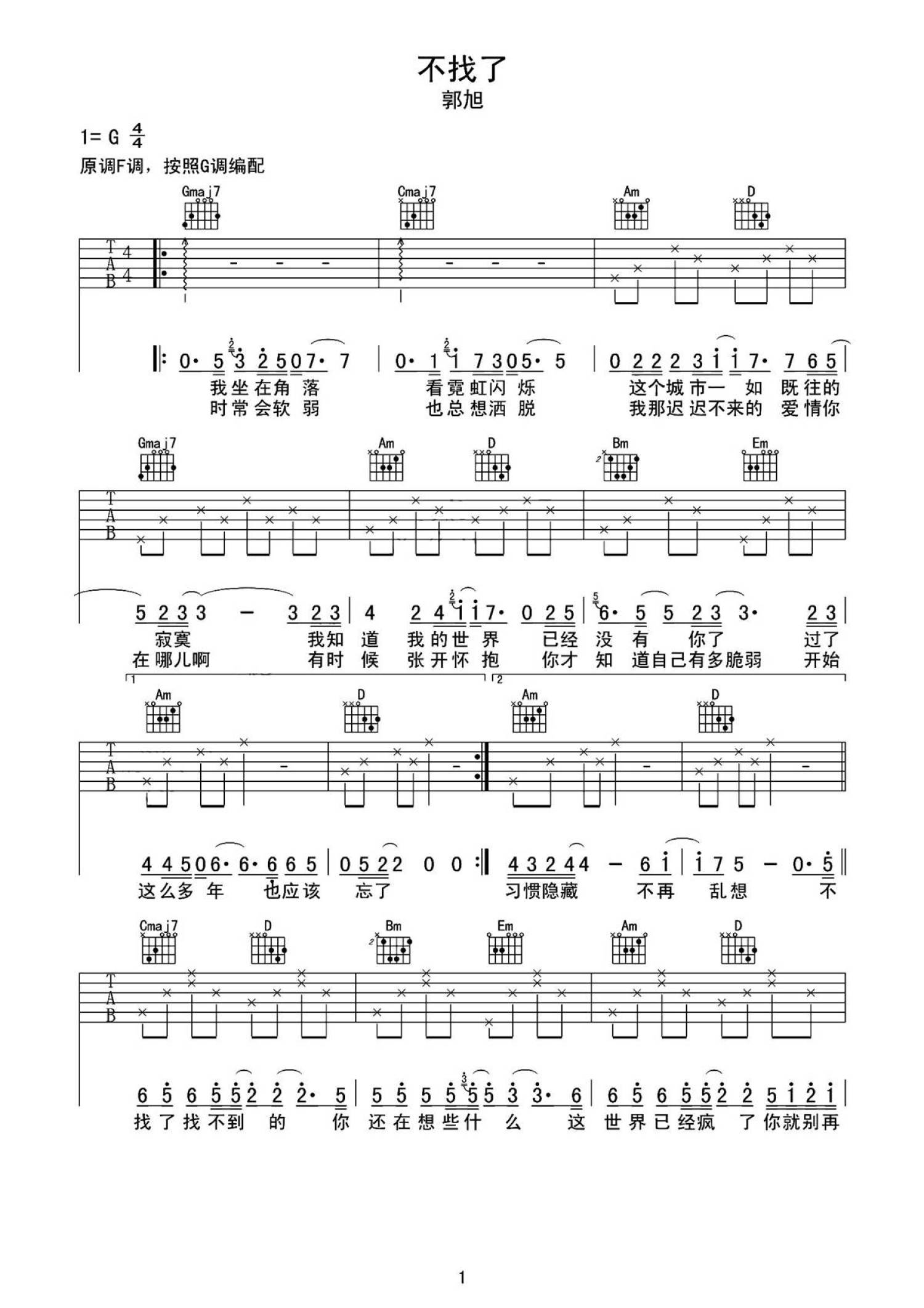 不找了吉他谱 - 郭旭 - G调吉他弹唱谱