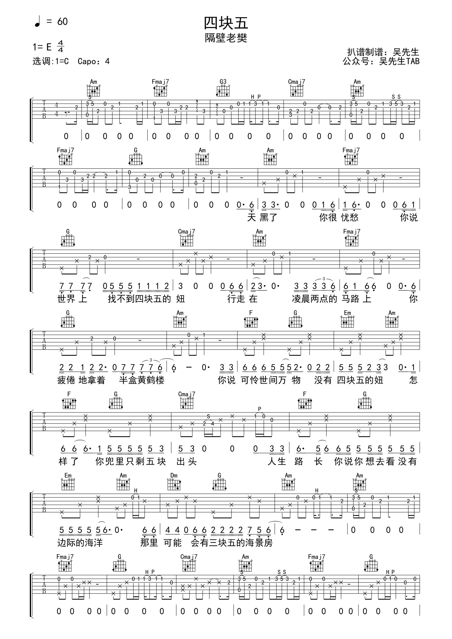 • 四块五吉他谱 - 隔壁老樊 - C调吉他弹唱谱第1张