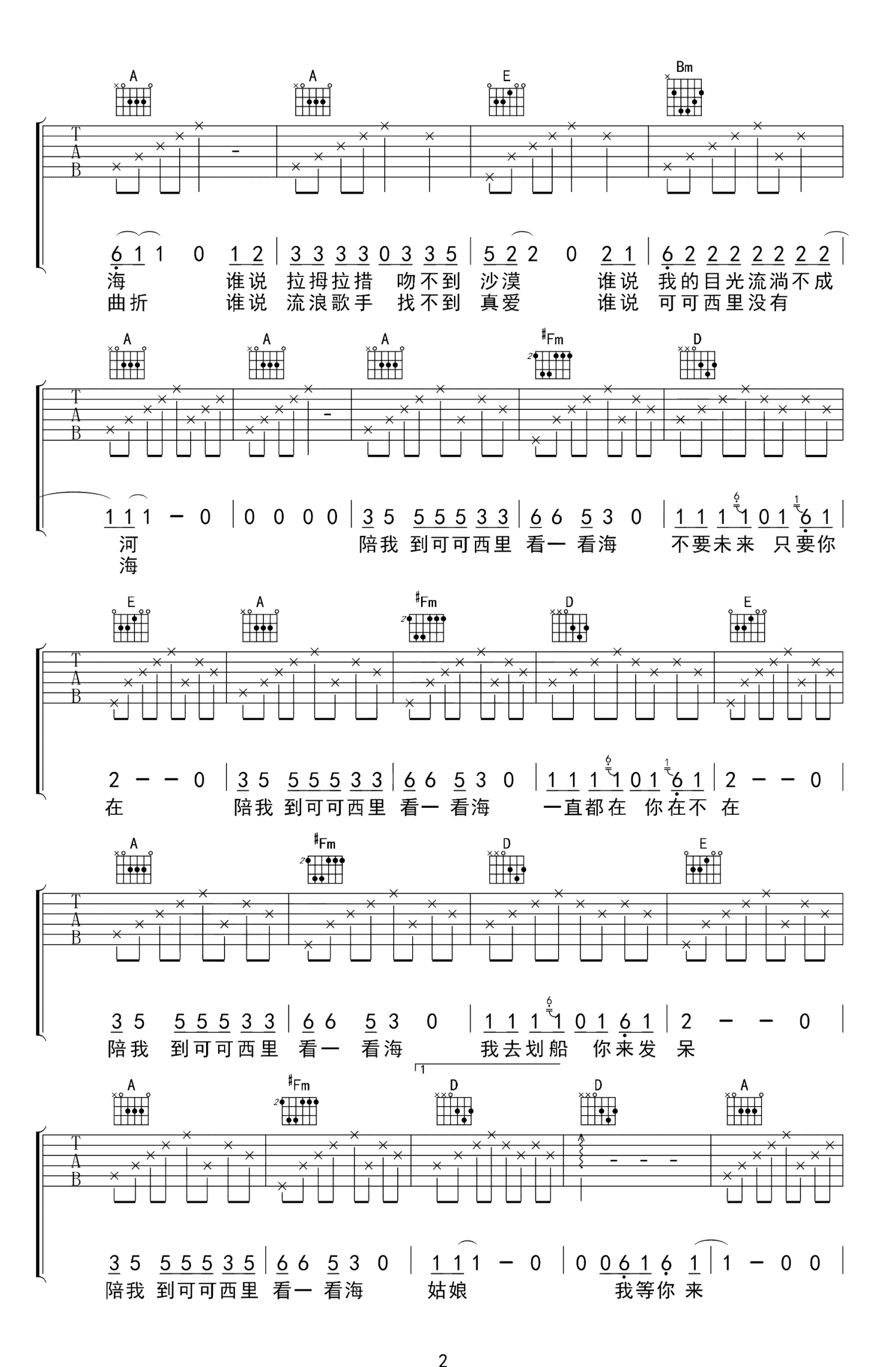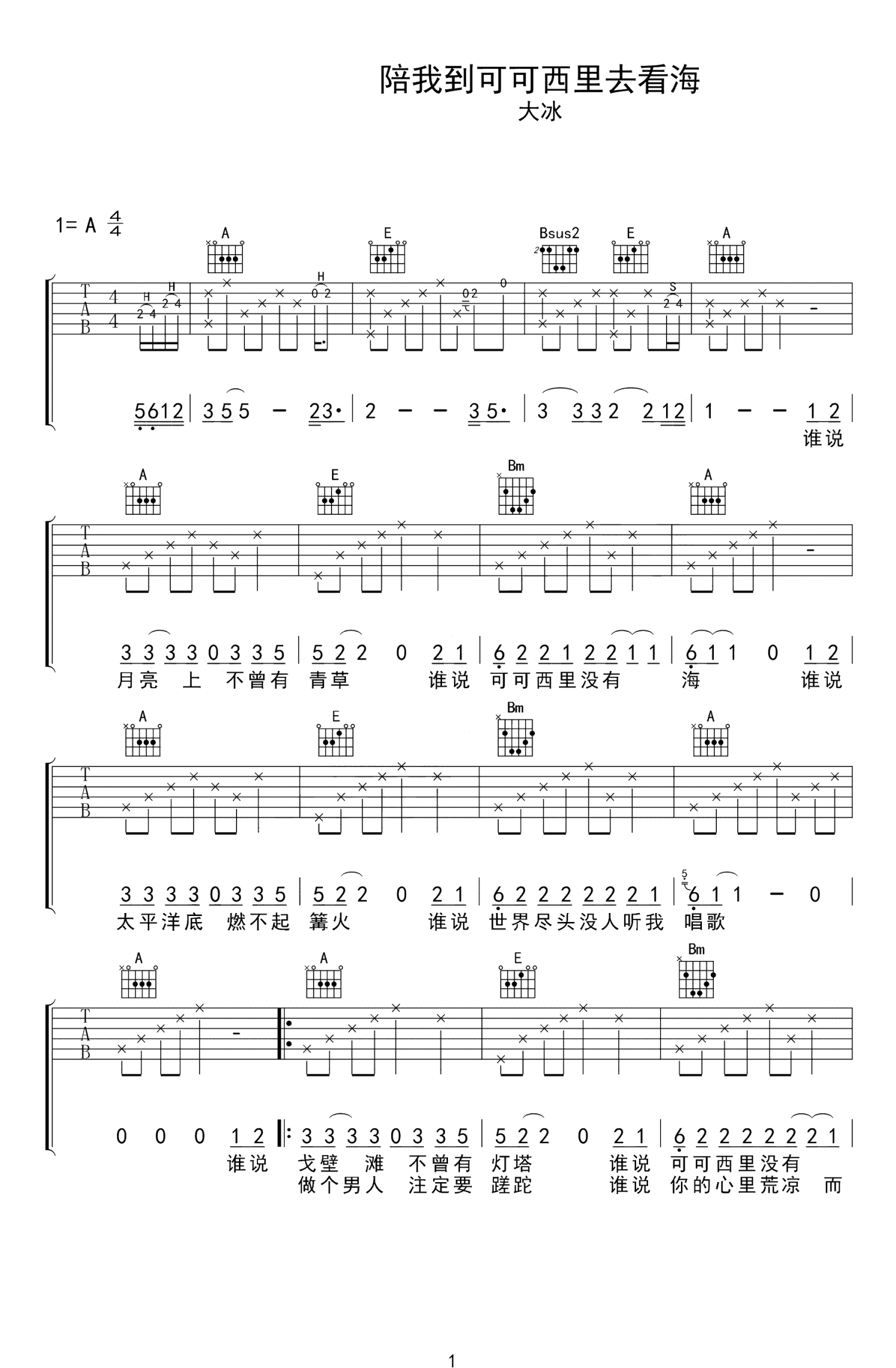 陪我到可可西里去看海吉他谱 - 大冰 - A调吉他弹唱谱