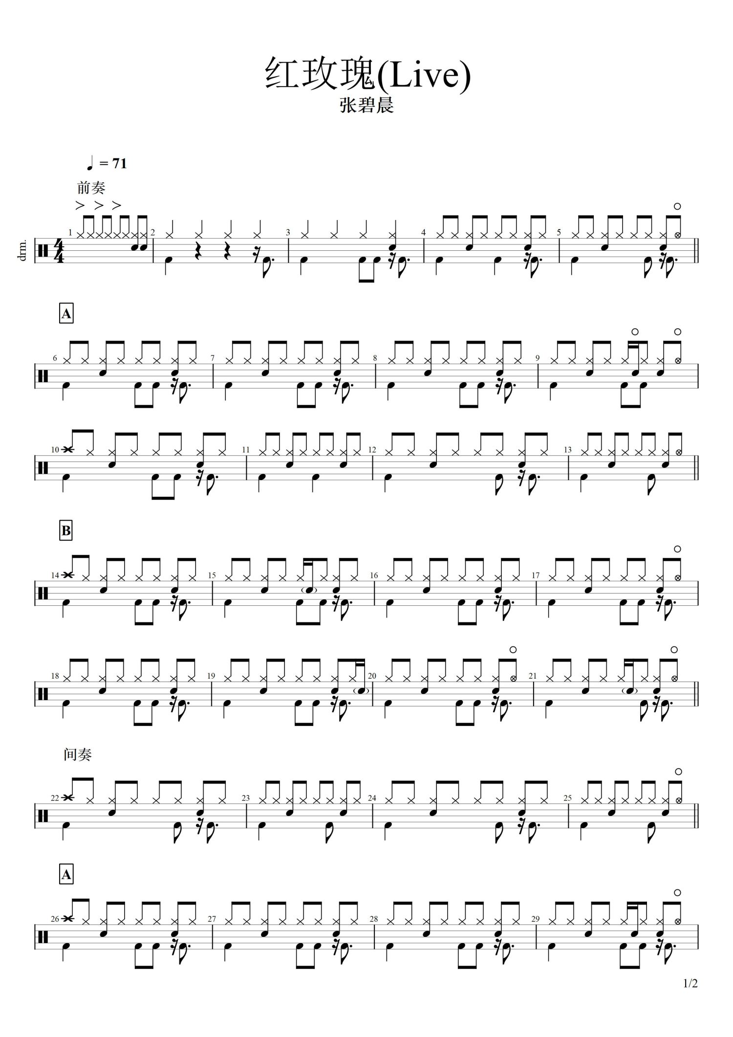 • 红玫瑰鼓谱 - 张碧晨 - 架子鼓谱第1张