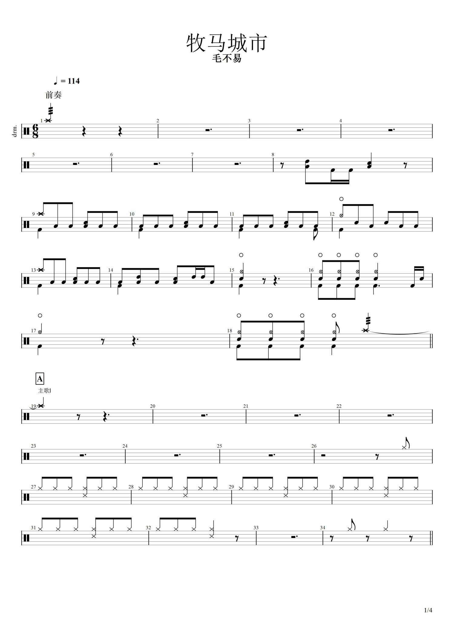 • 牧马城市鼓谱 - 毛不易 - 架子鼓谱第1张