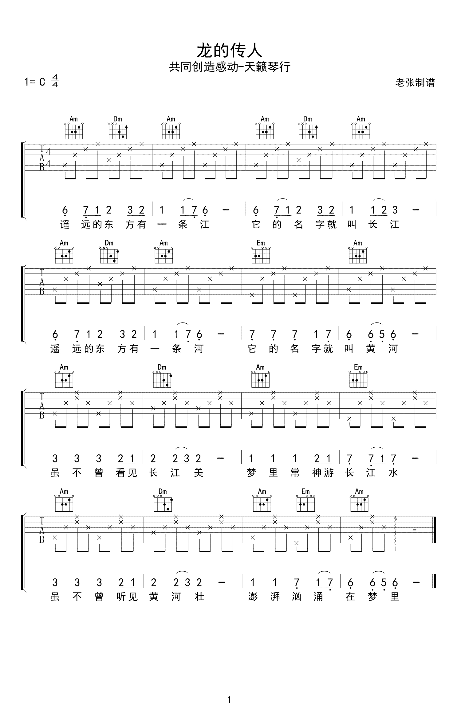 曲谱介绍: 龙的传人吉他谱,C调弹唱谱,简单入门版教学曲谱,侯德健的一首经典代表作品,于1978年创作,由台湾男歌手李建复原唱,后经香港歌手张明敏演绎,传遍中国大江南北,而龙的传人也成为中国人的民族别称。歌曲唱出中国人希望国家富强、民族振兴的心情,引起了人们的强烈共鸣。王力宏的翻唱此曲又赋予了这首歌新的意义。